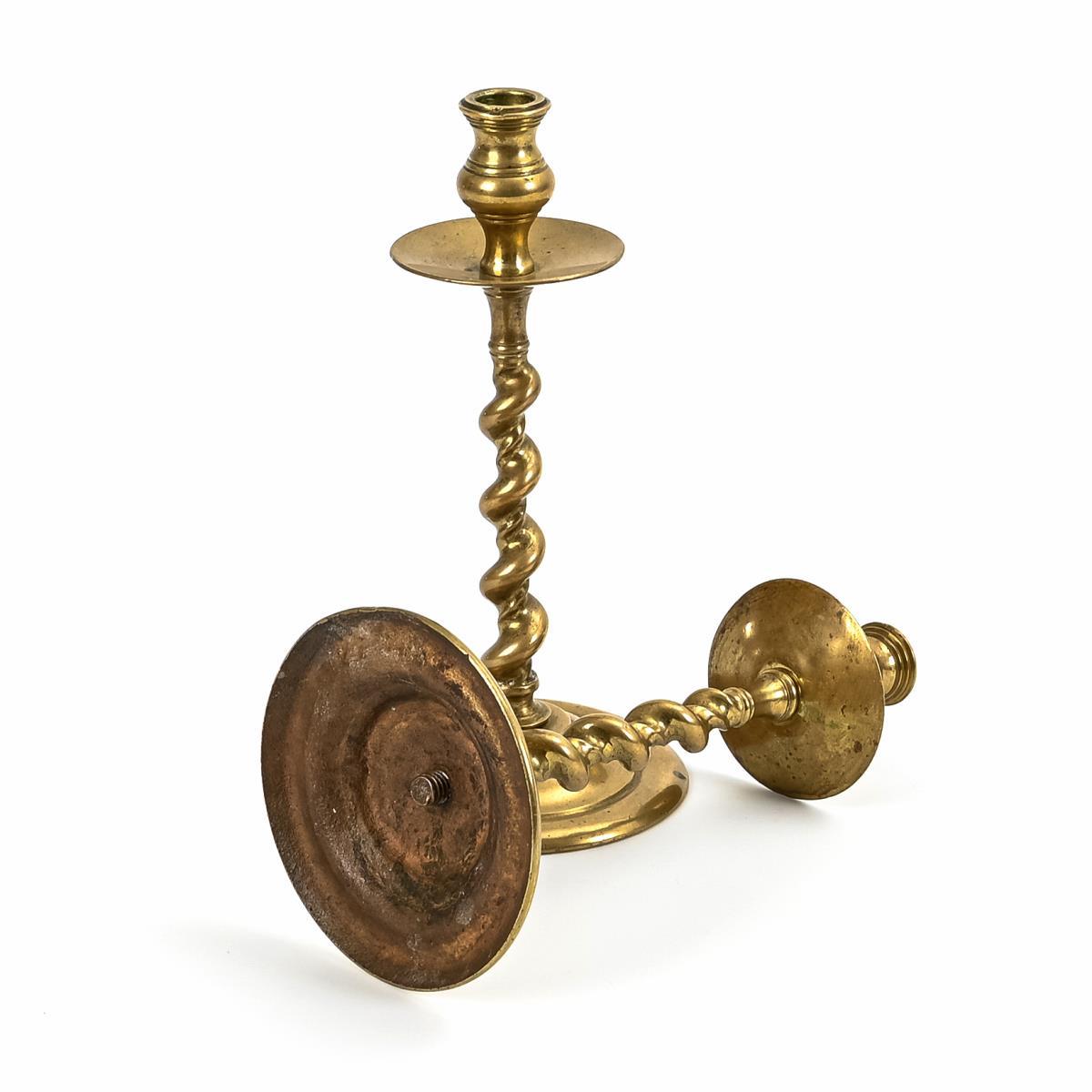 Bronze candlestick with round base, spiral twisted shaft and vase spout above the drip tray. Possibly screw fittings added to the base.