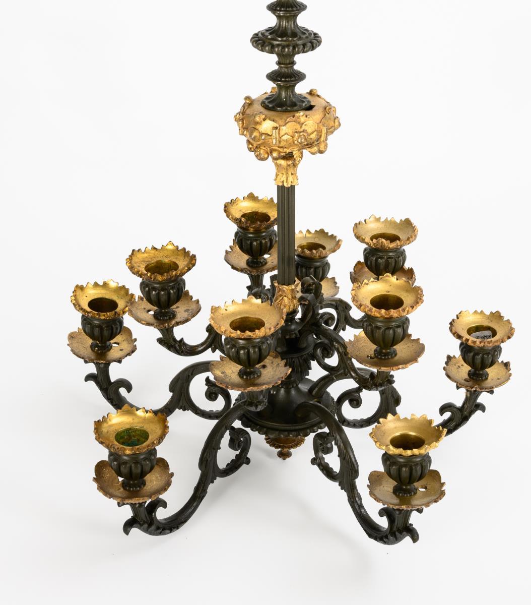 Splendidly reliefed ceiling candlestick in contrasting gold and black with multiple coiled shaft and vase nozzles on the leaf-covered volute arms in 2 steps. Drill holes from removed electrification.