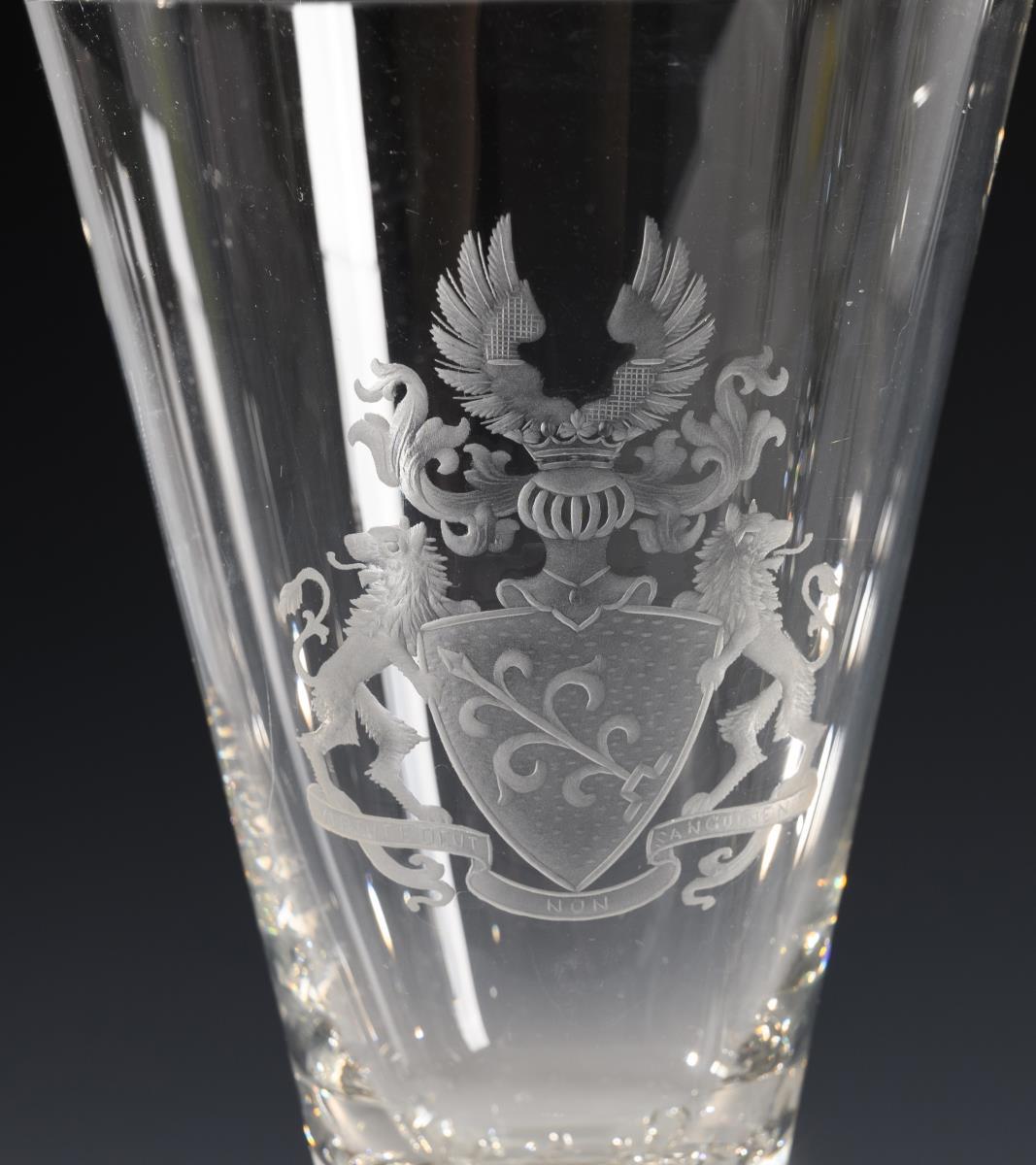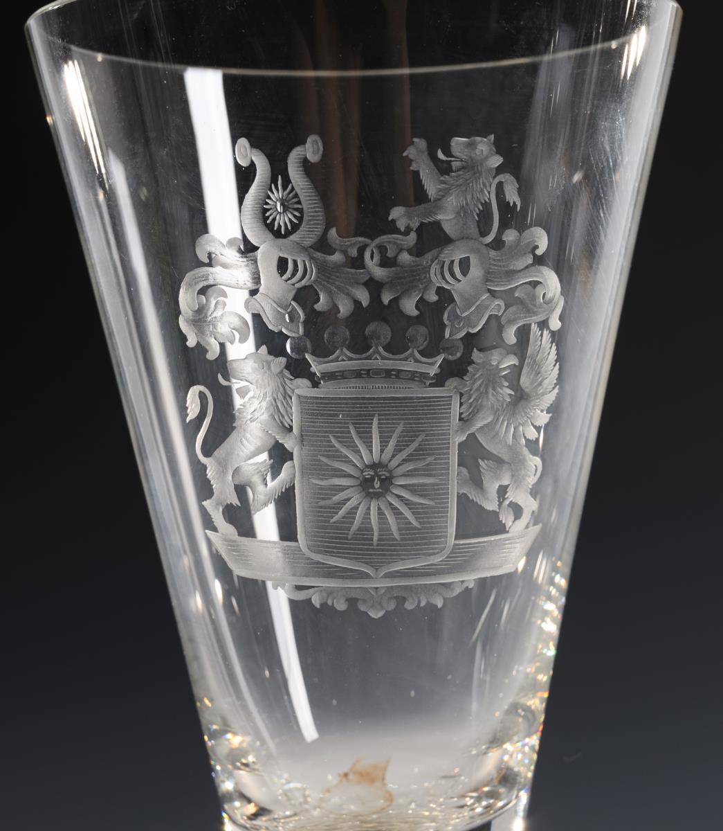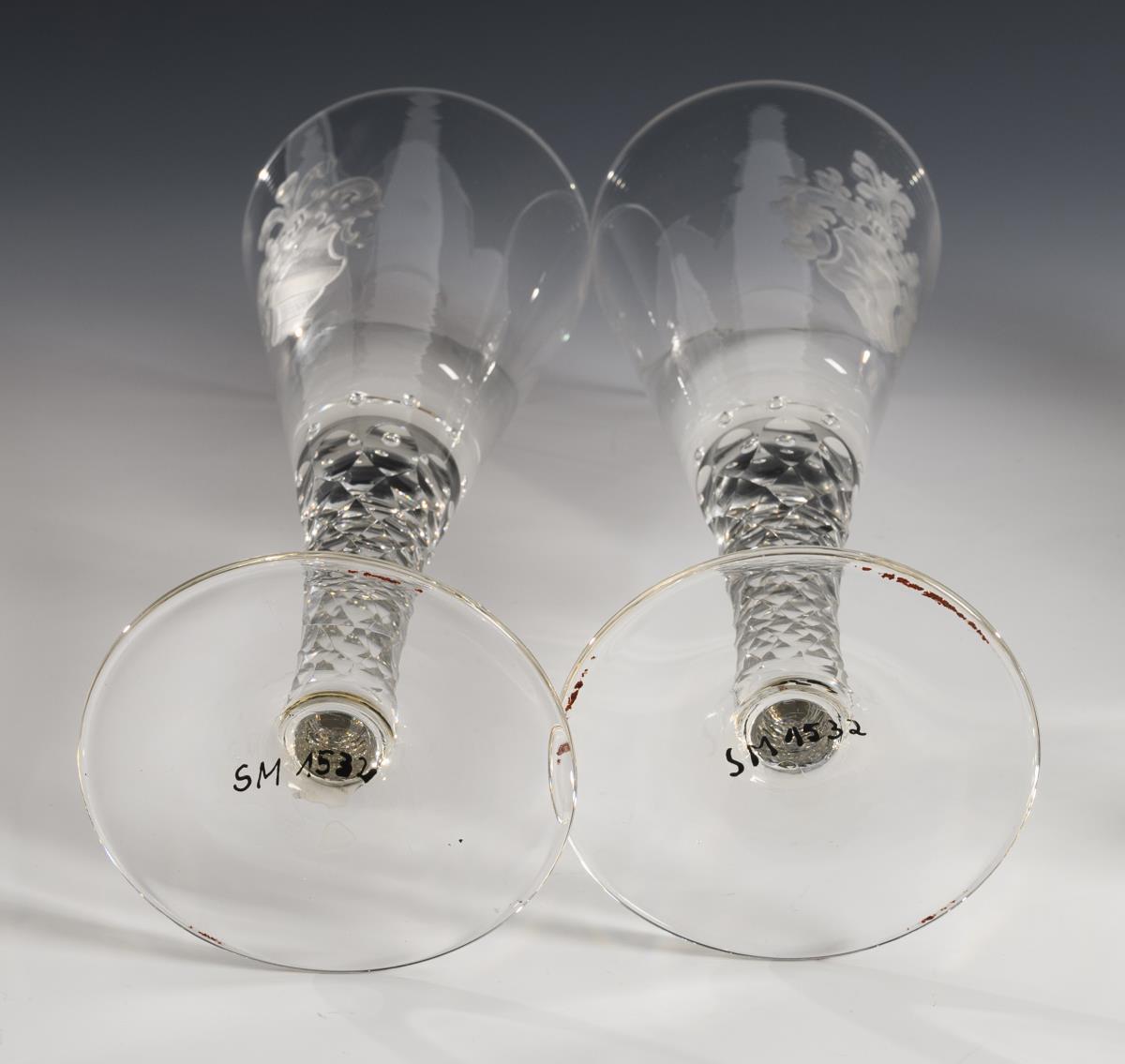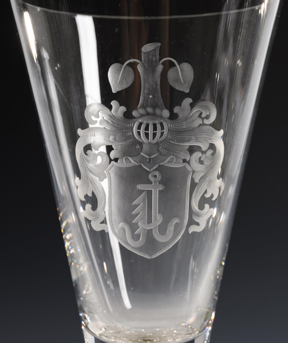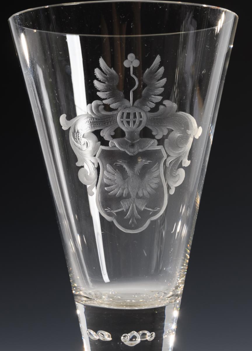 Conical goblets with a pierced bubble rim in the base, honeycomb-faceted stem, round foot. Finely engraved coats of arms on the front (including the von Lossow, von Rintelen and von der Decken families).