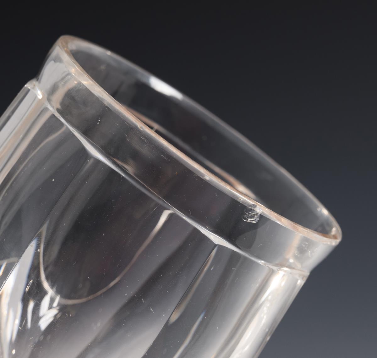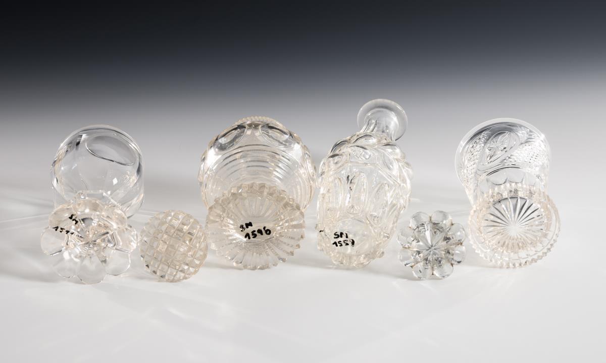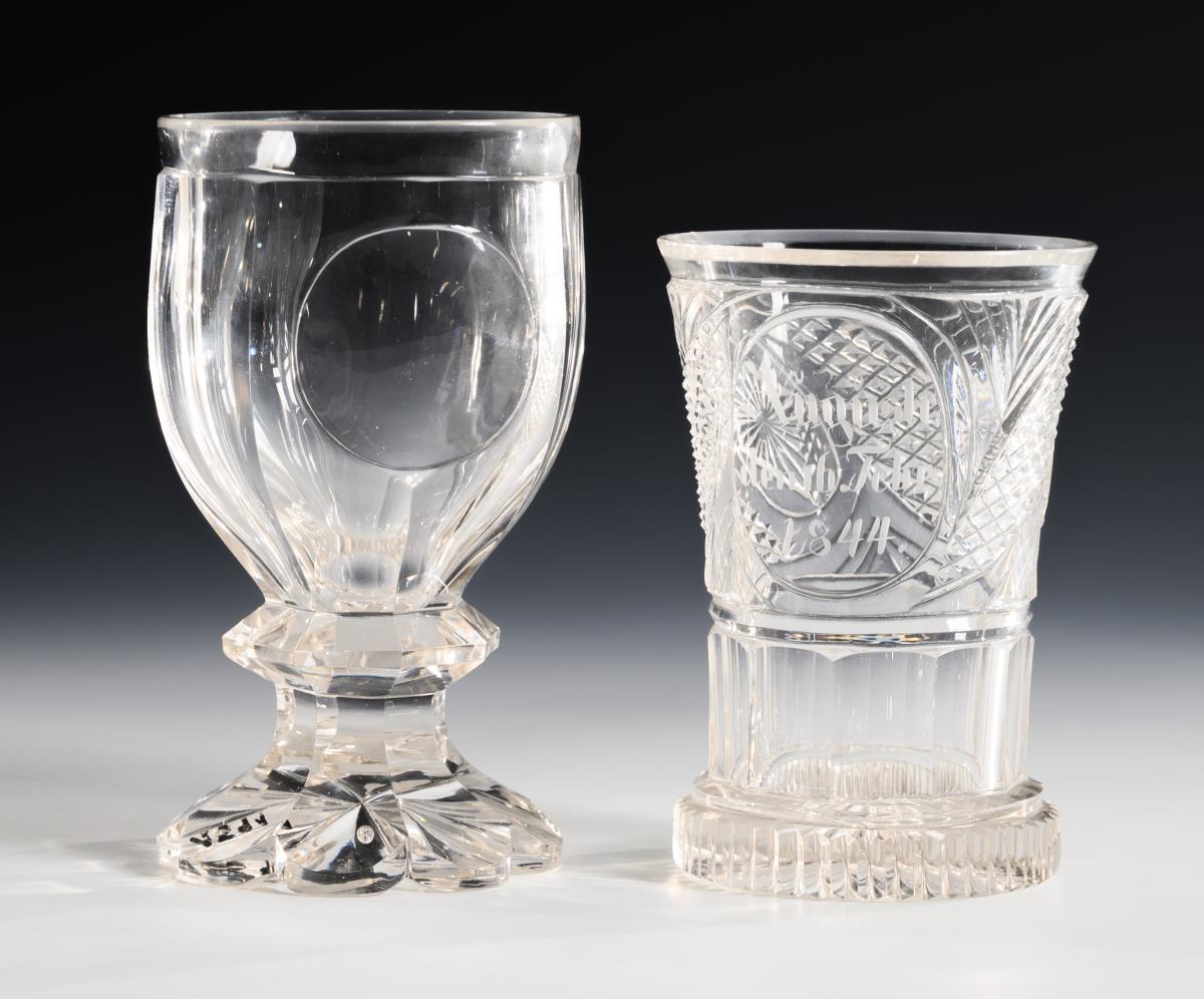 1x baluster carafe with facet cut, pointed bow and leaf band (h 21.5 cm). / 1x bulbous carafe with notch, steinel and lentil cut decoration (H 15.5 cm). / 1x Ranft beaker with notch and stone-cut decoration and engraved inscription "Auguste. en 16. Febr. 1844." / 1x faceted goblet with high-cut medallion on the dome, faceted stem, multi-pass foot (h 14 cm). Chip on the rim of the goblet, cut edges of the rim with minimal chips, stopper of a carafe chipped.