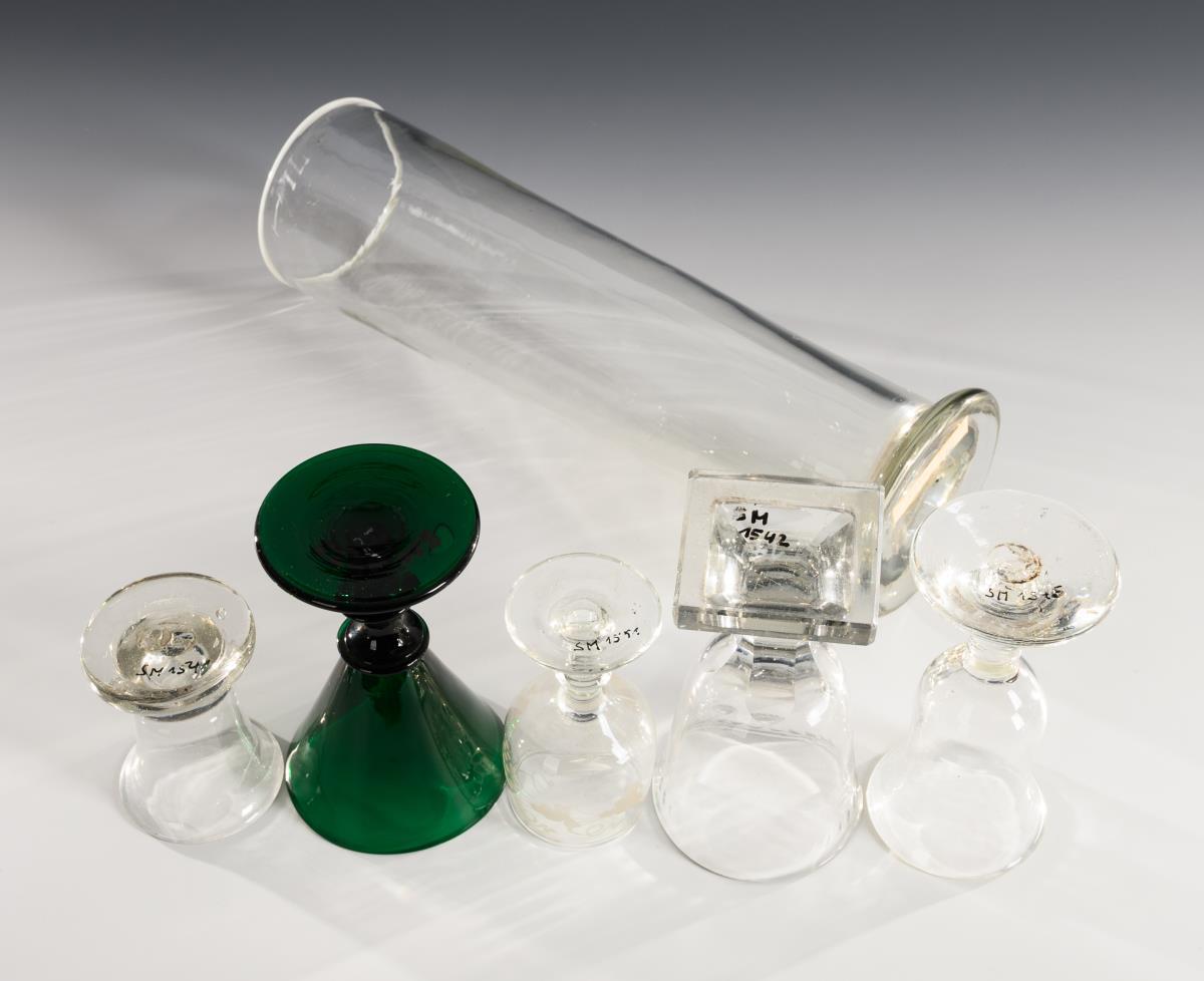 Colorless glass, 1x dark green glass.
