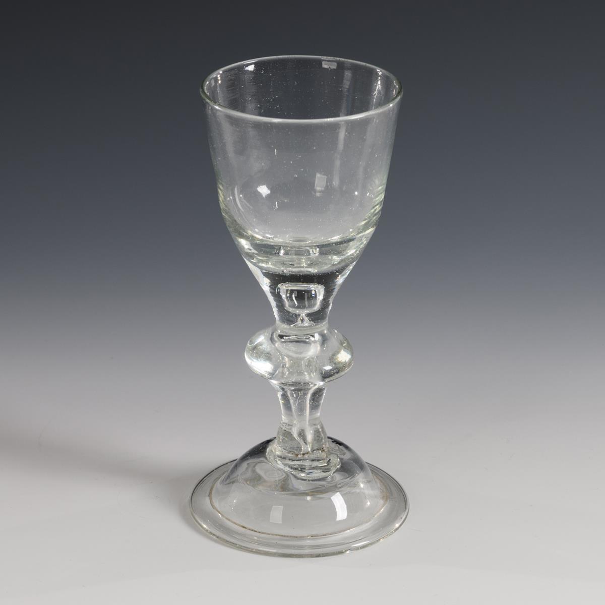 Conical bowl with pierced air bubble at the base, baluster stem with pierced air bubble, bell foot with everted rim; demolition.