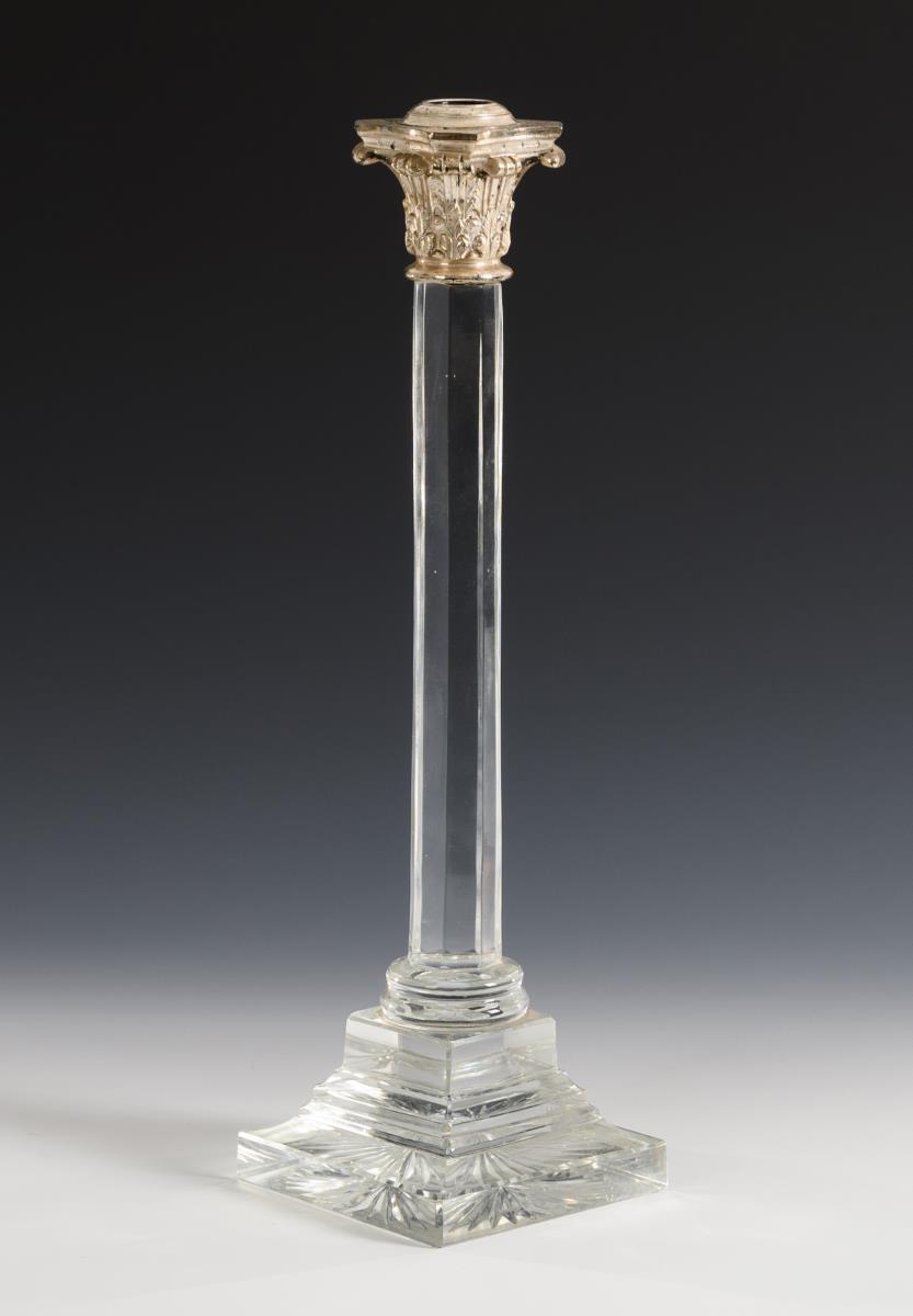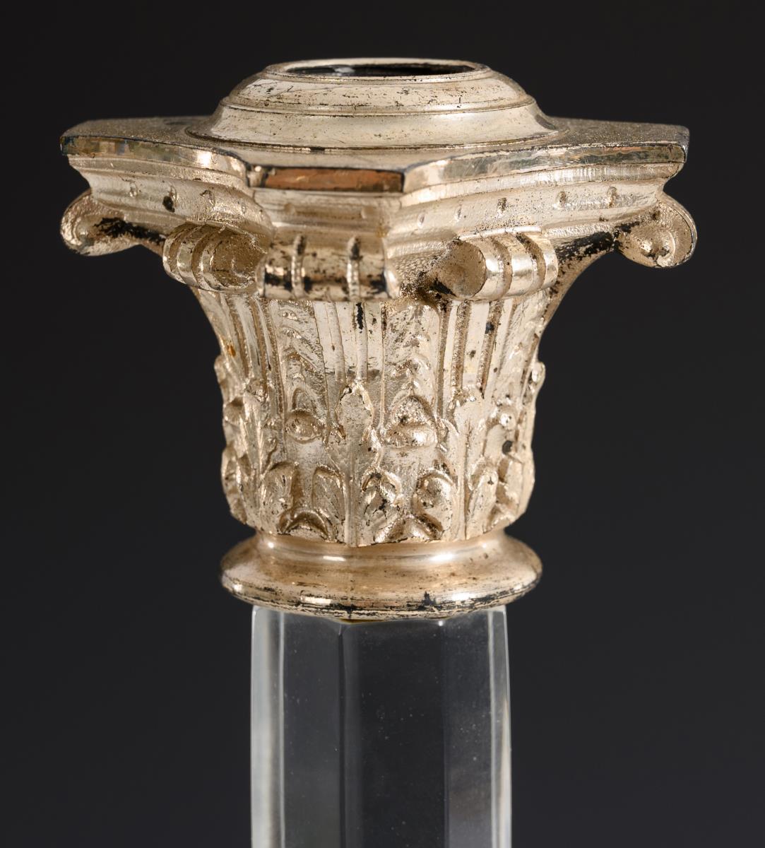 Candelabra base designed in the shape of a column with a faceted shaft, a Corinthian capital with a thread for screwing on the candelabra and a stepped, square foot.