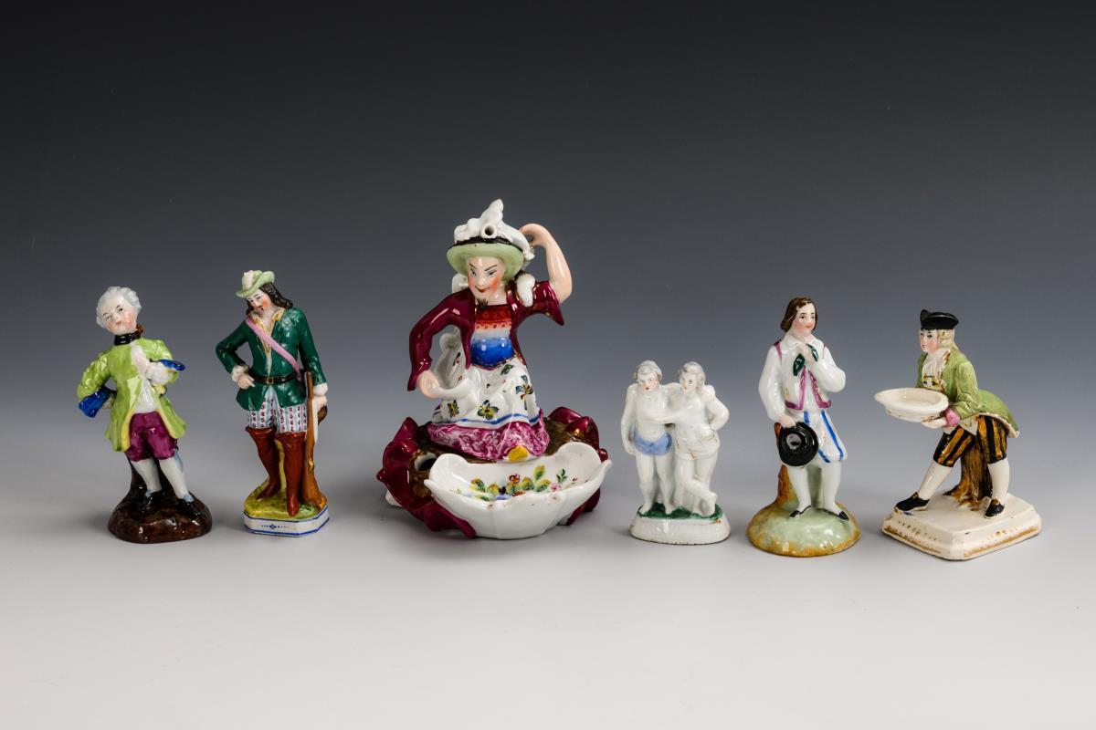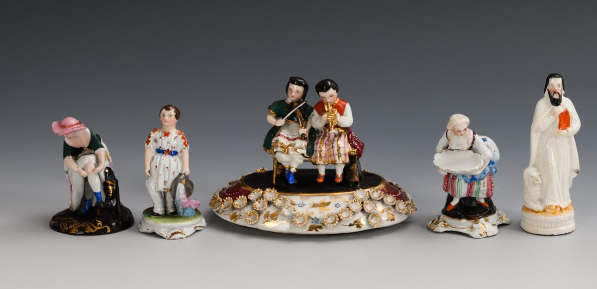 Various figures (including a gardener with a basket, a lady going to church, St. Mark the Evangelist, children's figures, a hunter, a Chinese man) and 1 box lid with a pair of children. Fire crack to the base of the gardener with basket, some of the lid's flower covering and the hunter's hat feather chipped, a boy's thumb missing.