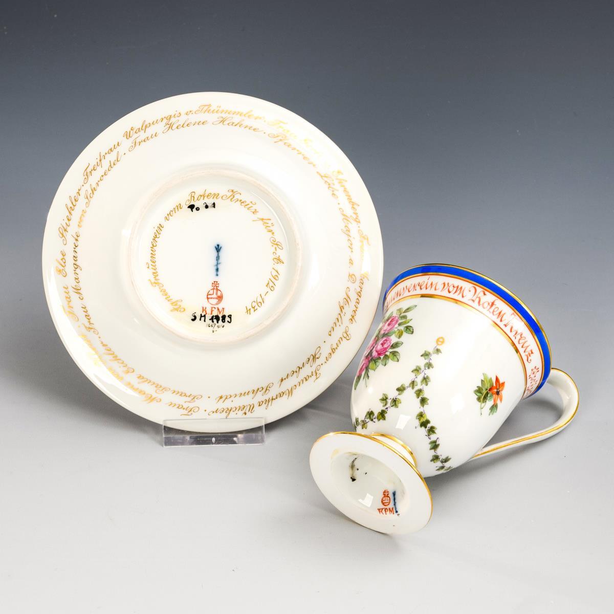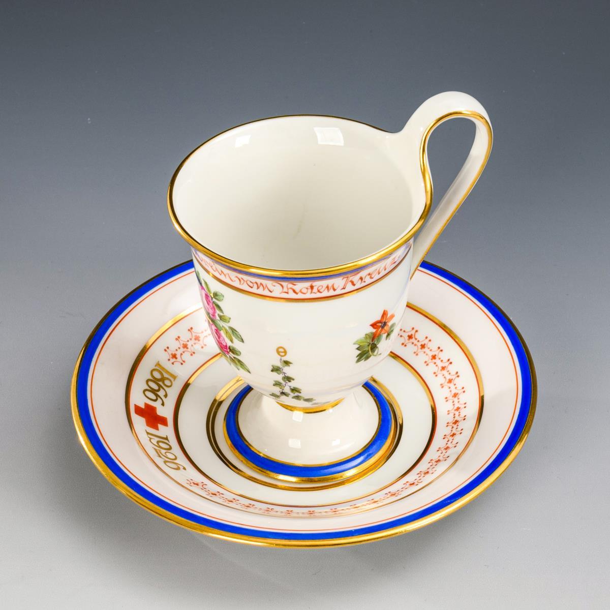 Footed bell-shaped cup with high curved handle. On the front a bouquet of roses over ivy festoons, on the rim the inscription "Vaterländischer Frauenverein vom Roten Kreuz", on the saucer the dates "1866 + 1926". On the underside of the saucer the names of the members and the inscription "Agnes-Frauenverein vom Roten Kreuz für S.-A. 1912-1934".