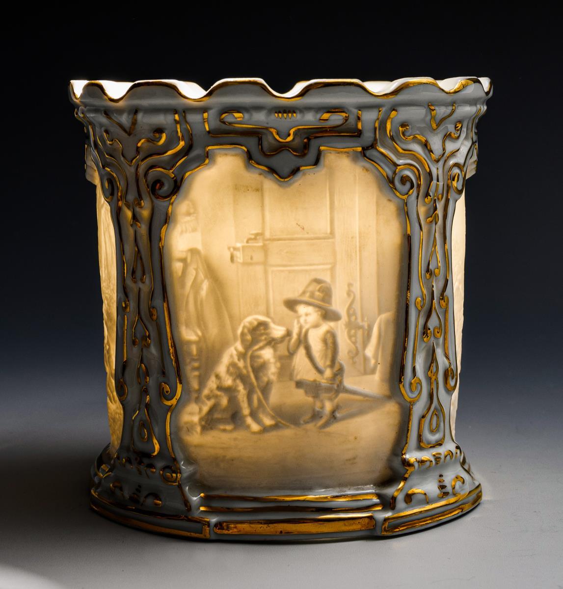 Cylindrical teapot with four lithophane pictures (children's scenes), as an insert a small tea pot with dragon's head and handle.