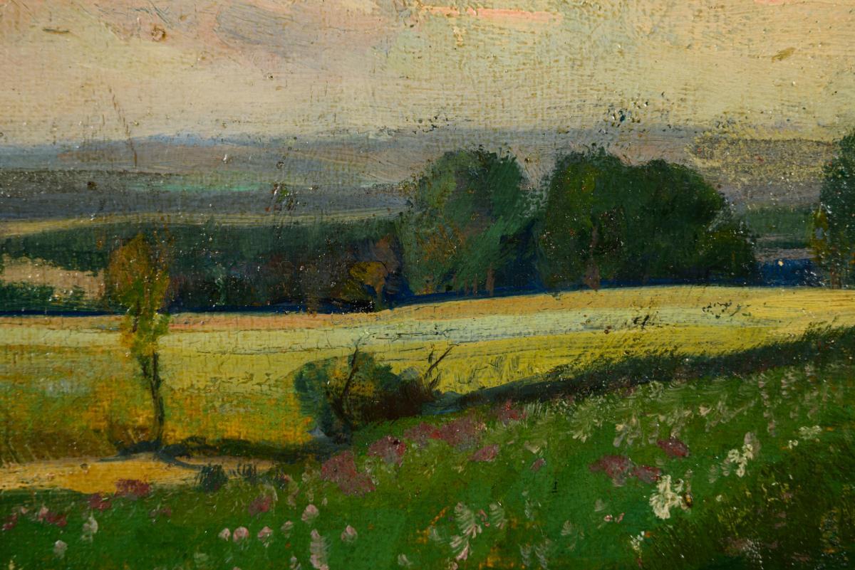 Flowering meadows in a wide landscape with scattered woodland. Slight traces of age.