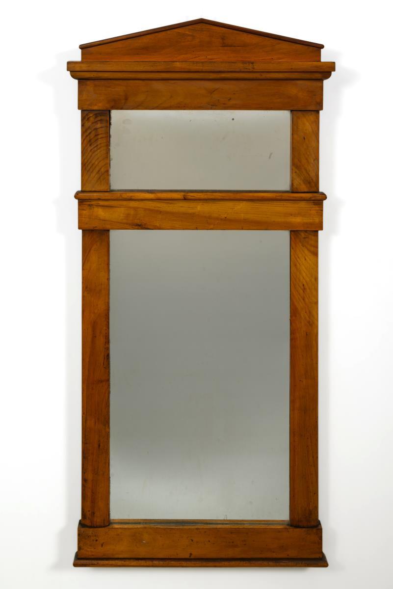 Architecturally structured wall mirror with pointed pediment. Restored, slight signs of age/use, mirror glass replaced.