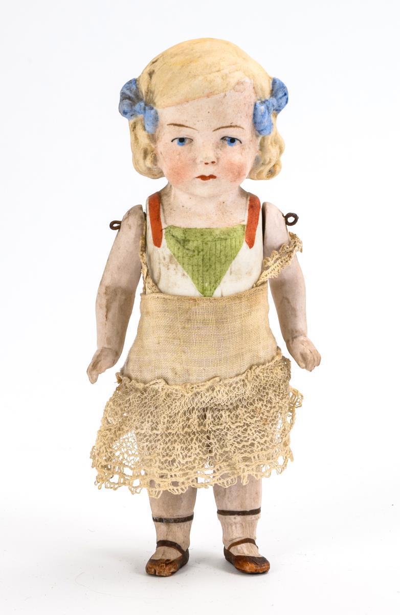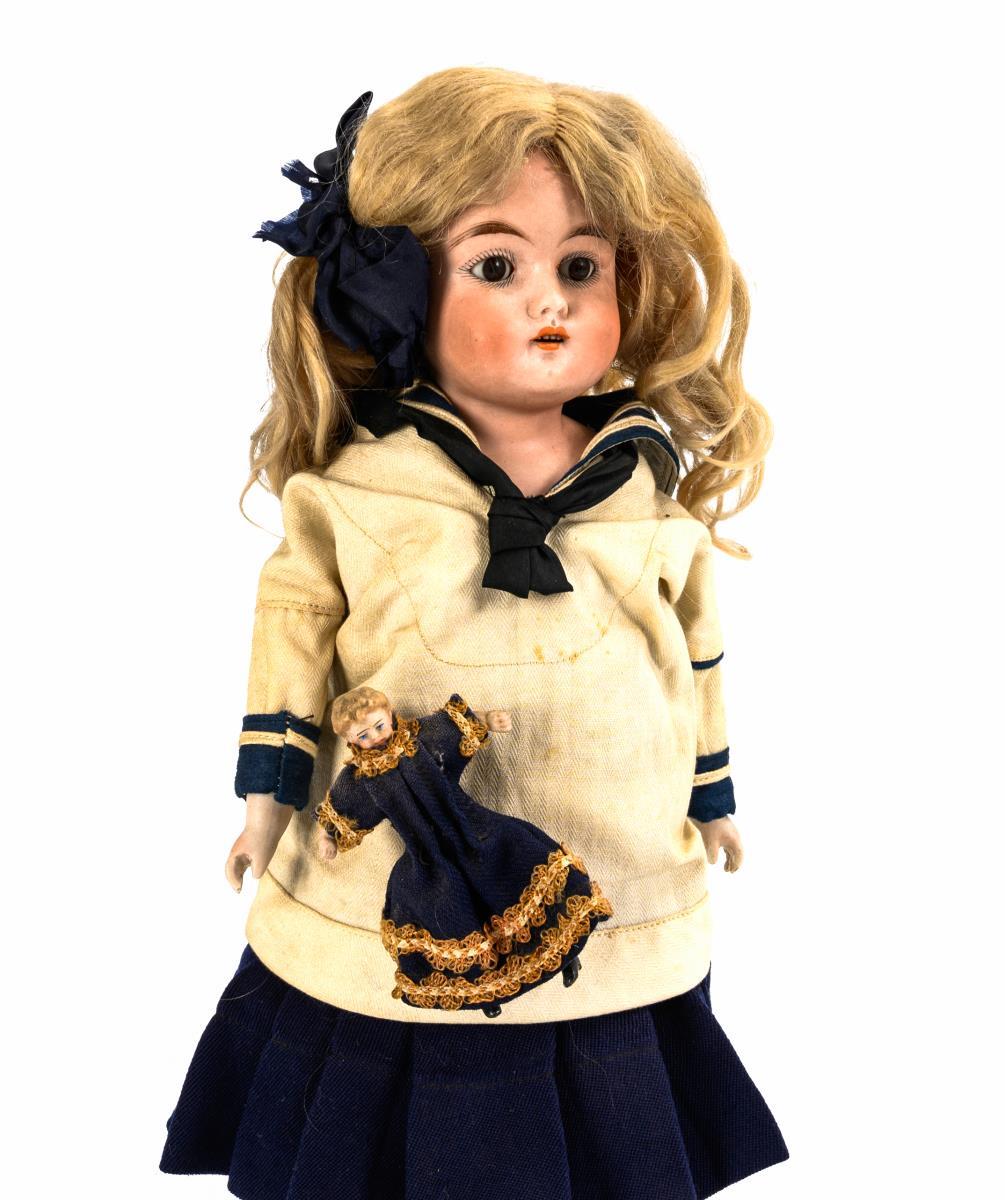 Franz Schmidt & Co (Germany FS & C 1181 marked) breast head girl with brown sleeping eyes, blond mohair wig, leather body, bisque forearms and beautiful sailor dress. Head x-rayed: without cracks, only a tiny chip on the front breast plate. Fingers bumped, body trickling (L 42 cm). With a full bisque figure with modeled hairstyle and blue hair ribbons (l 16 cm) and a small doll's house lady (l 9 cm). Some slight signs of age.