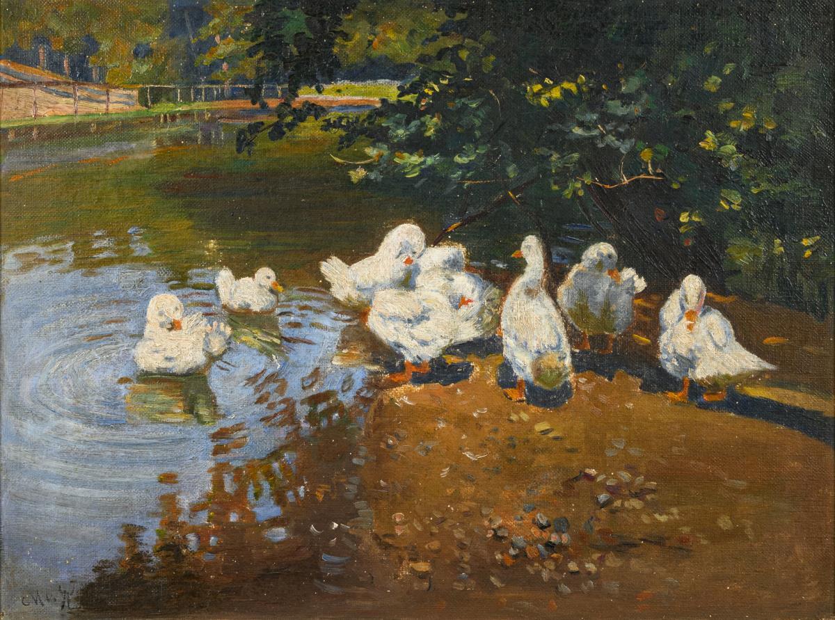 Animal painter: Ducks on the banks of a pond