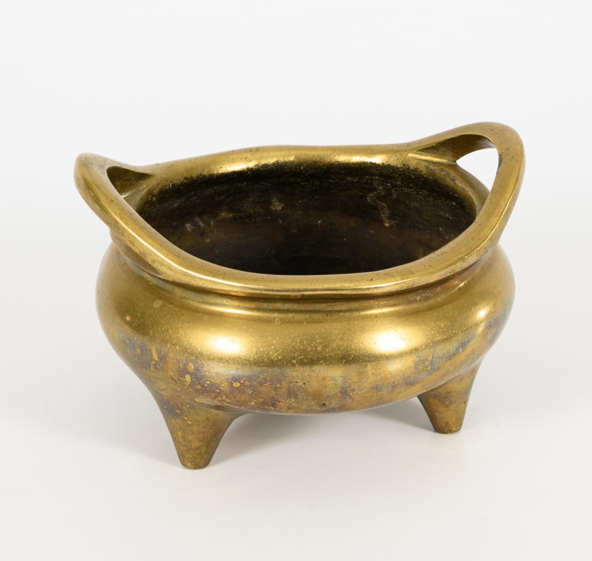 Very heavy, three-legged vessel with two handles.