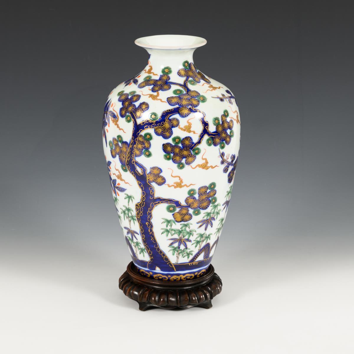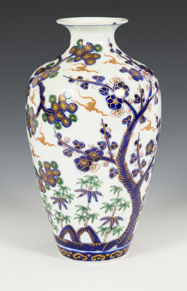 Baluster vase with three stylized blossom trees (cherry, pine and ?), complemented at the bottom by bamboo plants. Underglaze blue painting, supplemented with gold, green and red.