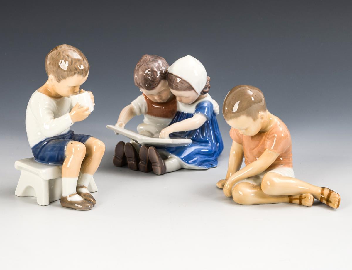 1x model no. 1567: seated pair of children looking at a book (h 10 cm). / 1x model no. 1713: boy sitting on a stool and drinking (H 13 cm). / 1x model no. 1671: boy sitting on the floor (H 10 cm).