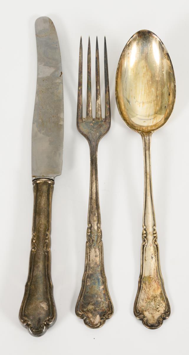 18 pieces with curved handle ends and engraved monogram "MA". Each with 6 dinner forks, dinner knives and soup spoons. Signs of use, 1 handle base with repair.