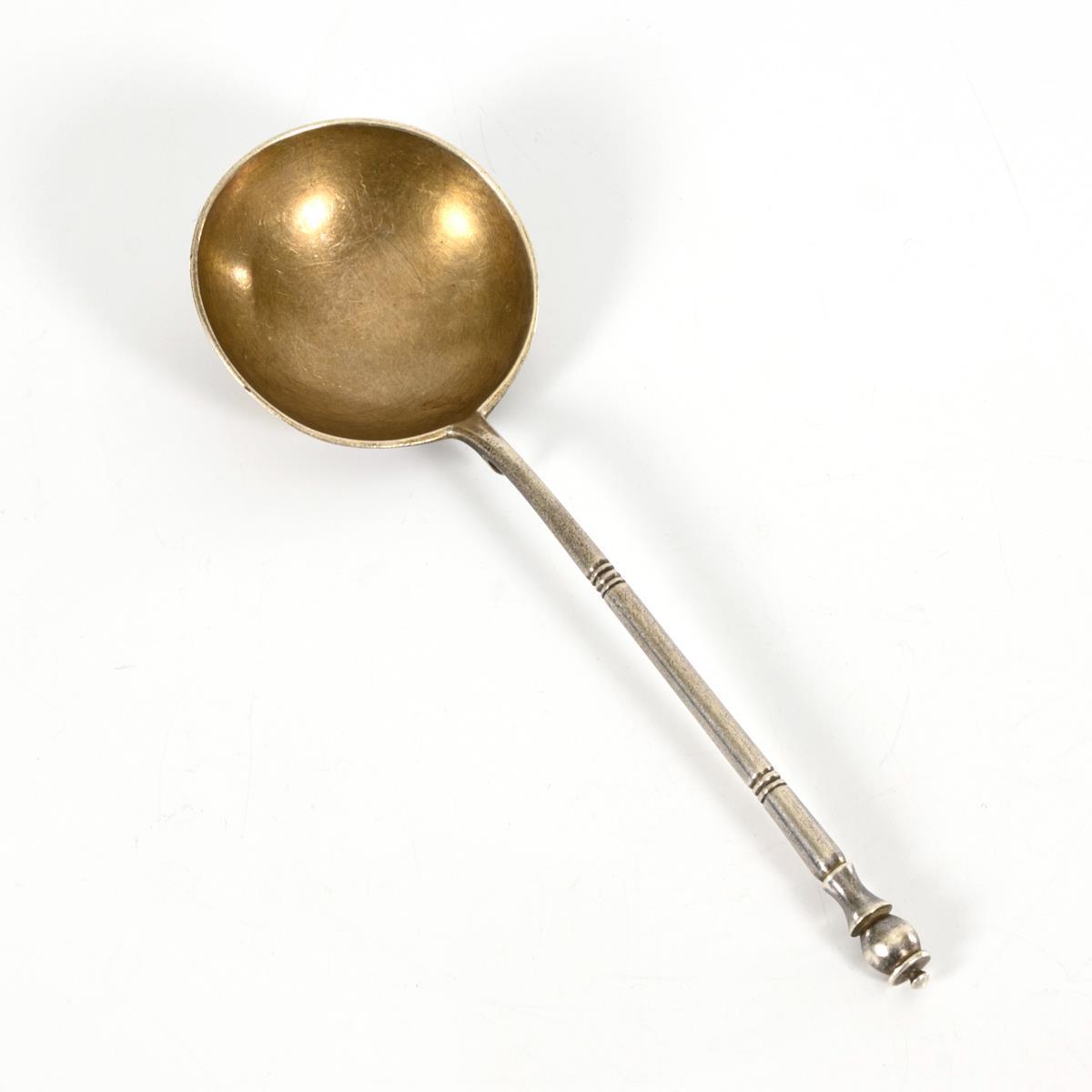 Silver spoon with round bowl, verso small monogram engraving "KHA". Bow with signs of wear, minimally dented.