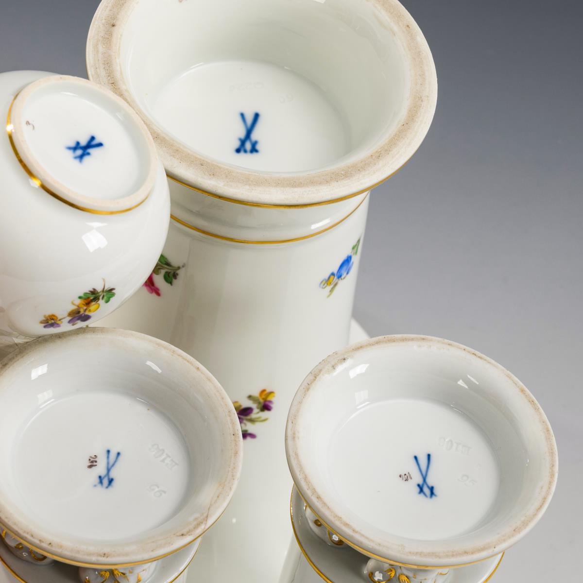 Crater vase (H 17 cm), 2 vases with four feet and round plinth (H 14.5 cm) and 1 milk jug (H 8 cm).