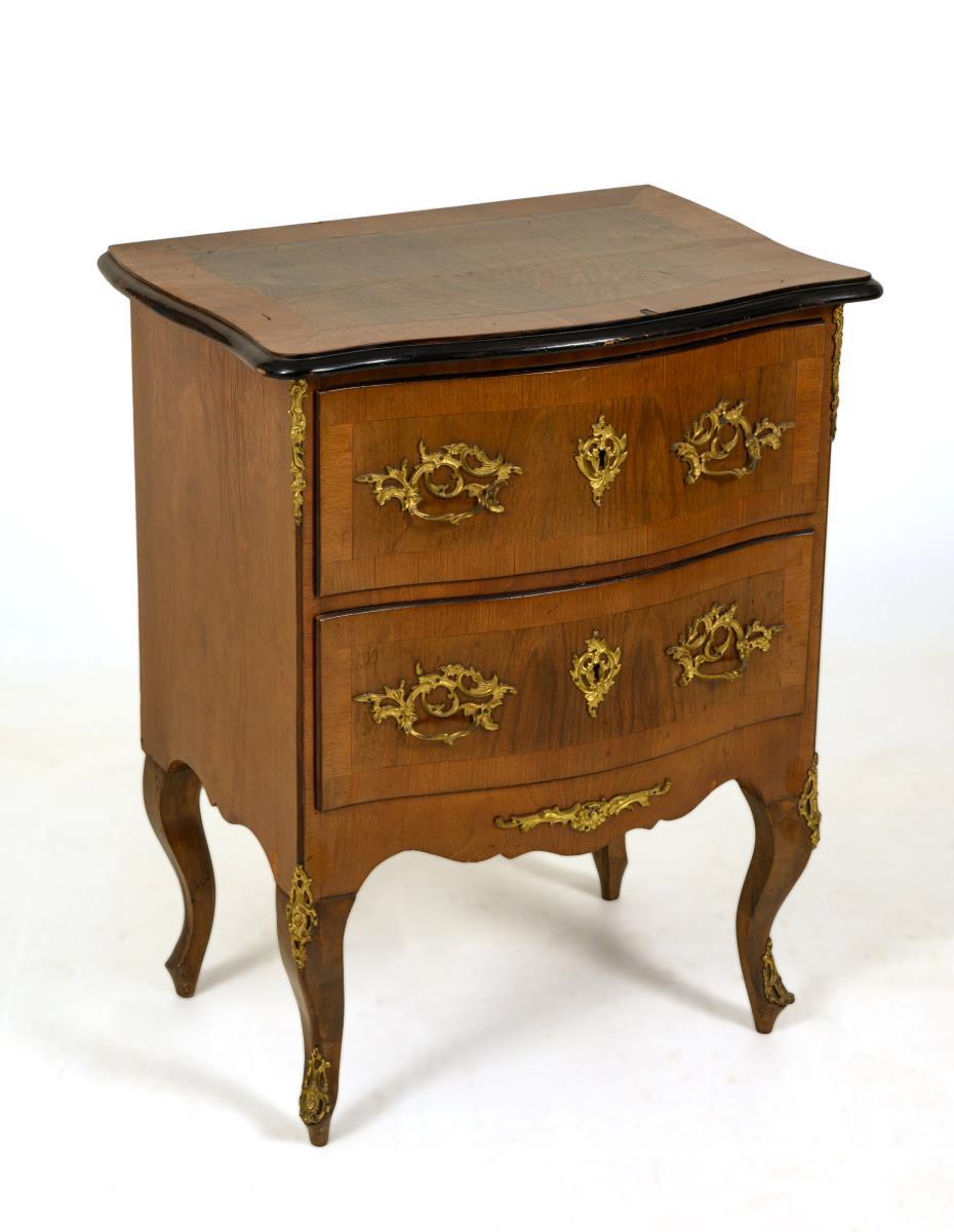 Small 2-tier chest of drawers in a curved form typical of the style on 4 curved legs; decorated with lavish bronze fittings and mirrored burl veneer. Signs of age/use, veneer with defects and dry cracks.