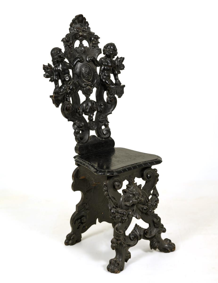 Lavishly decorated Renaissance-style armchair with openwork, sculpted backrest and front panel, embossed plank seat; decorated with scrollwork, sculpted mascarons and putti. Signs of age/use, somewhat wobbly.