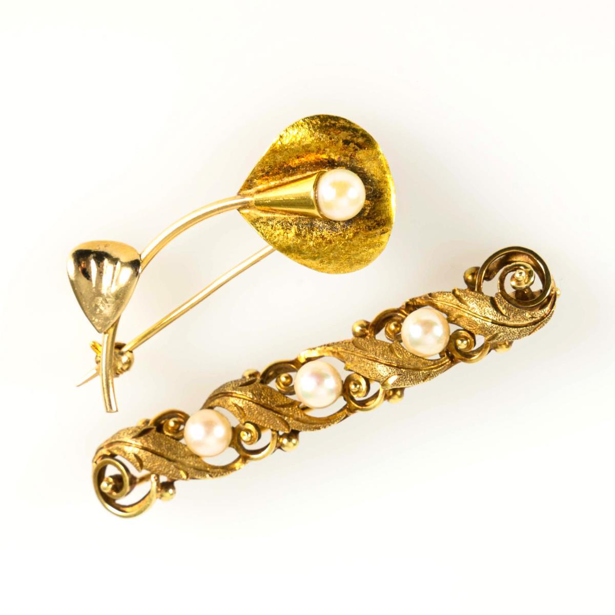 Stylized flower brooch with cultured pearl and floral ornament brooch with 3 cultured pearls. Ball hook, sliding hook.