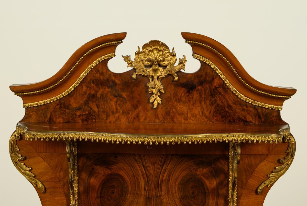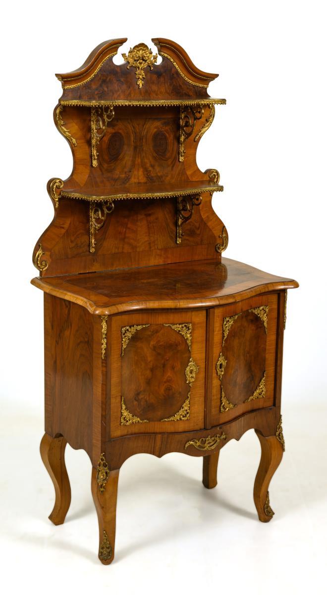 Elegant etagere cabinet in a curved form typical of the style, on a 2-door base with curved legs, top with a sprung pediment and 2 shelves; decorated with lavish bronze fittings. Signs of age/use, veneer with dry cracks and small defects.