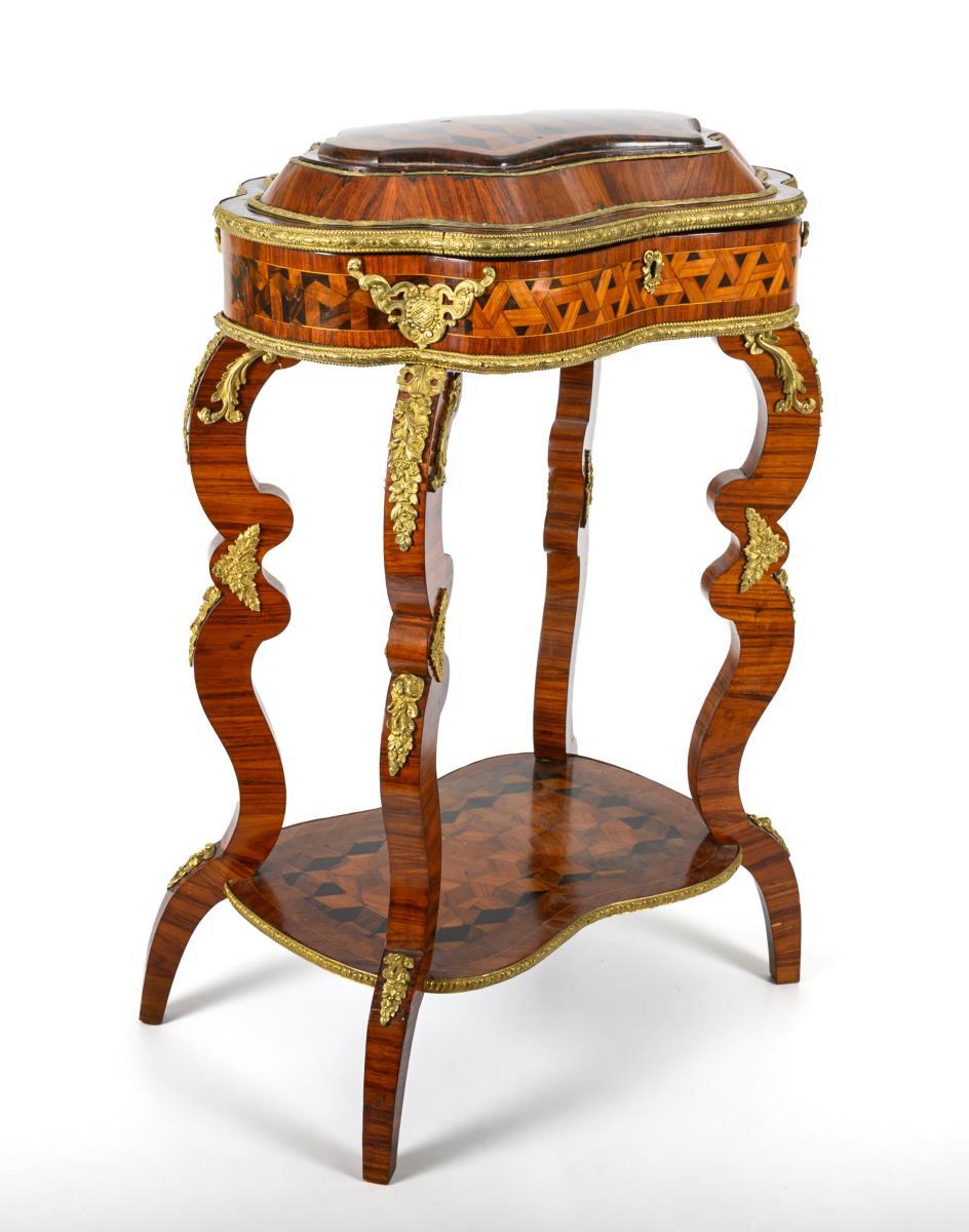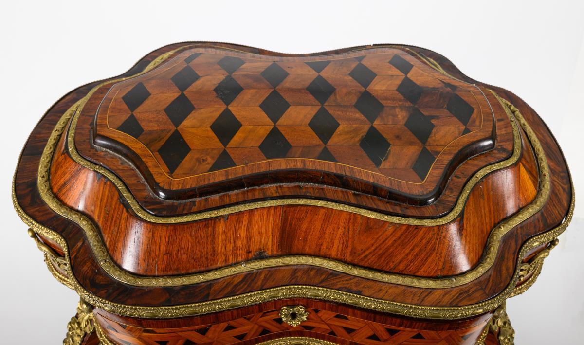Elegant sewing table in a curved shape typical of the style with a stepped arched top, on 4 curved legs with a plinth; richly decorated with ebonized diamond marquetry, cube marquetry, burl veneer and opulent bronze fittings; fanned inside. Traces of age/use, restored.