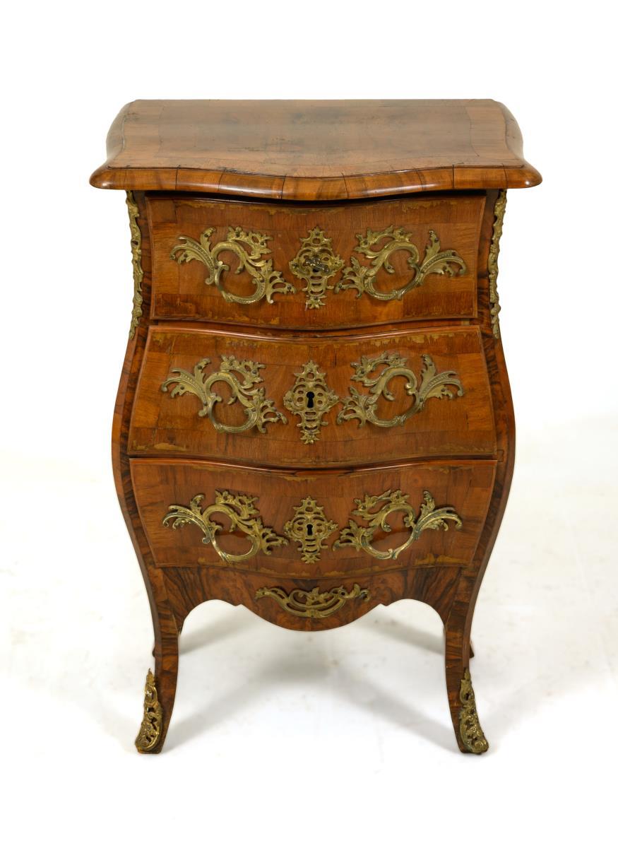 Small, arched, 3-tier chest of drawers in a curved shape typical of the style on 4 curved legs; decorated with lavish bronze fittings and mirror veneer. Signs of age/use, veneer with sanding marks, small defects and retouches.