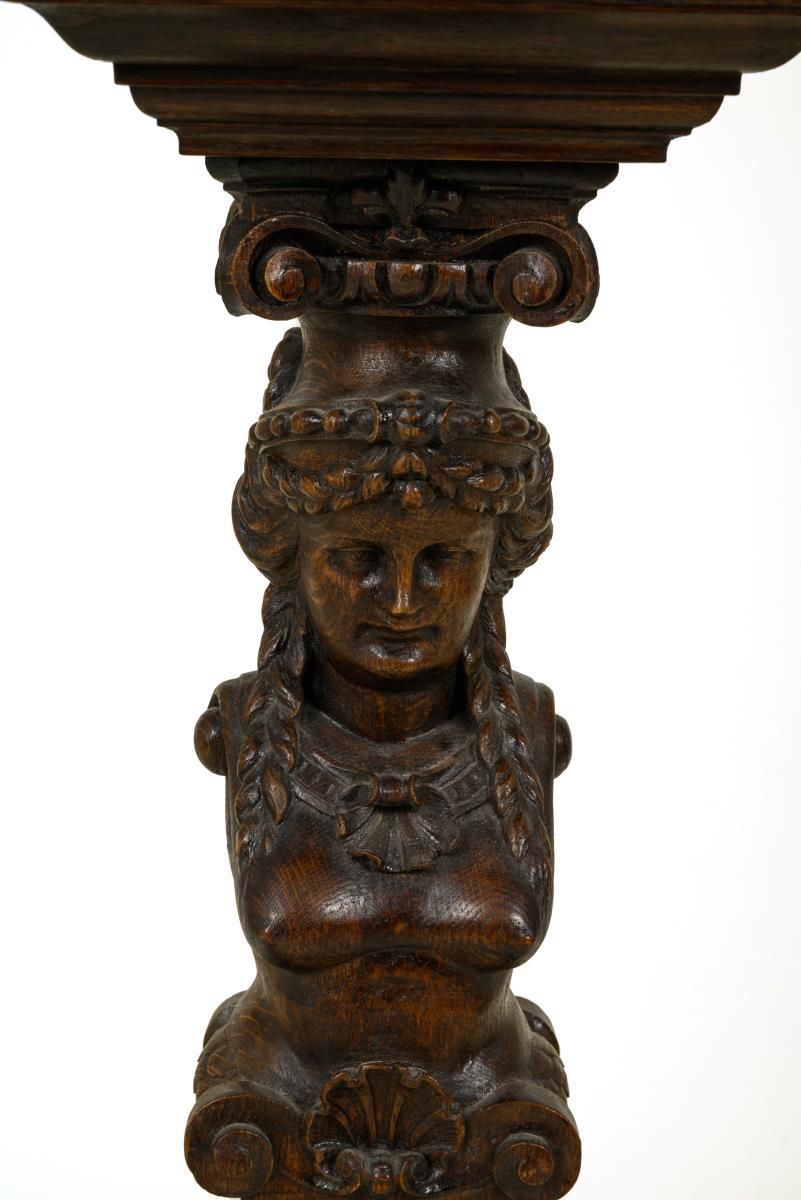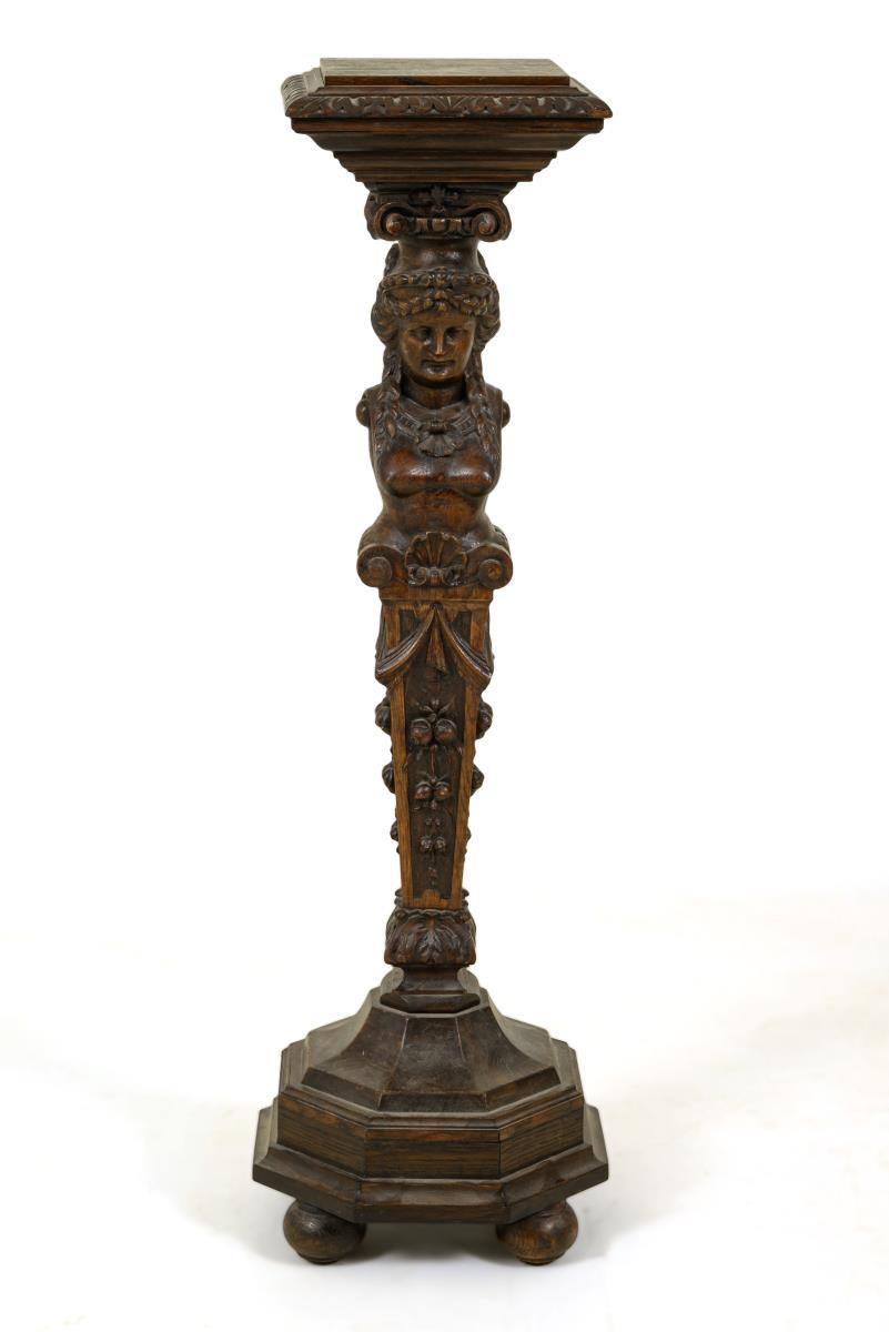 Renaissance-style flower stand with fully sculpted caryatid support and octagonal base with flattened ball feet. Signs of age/use.