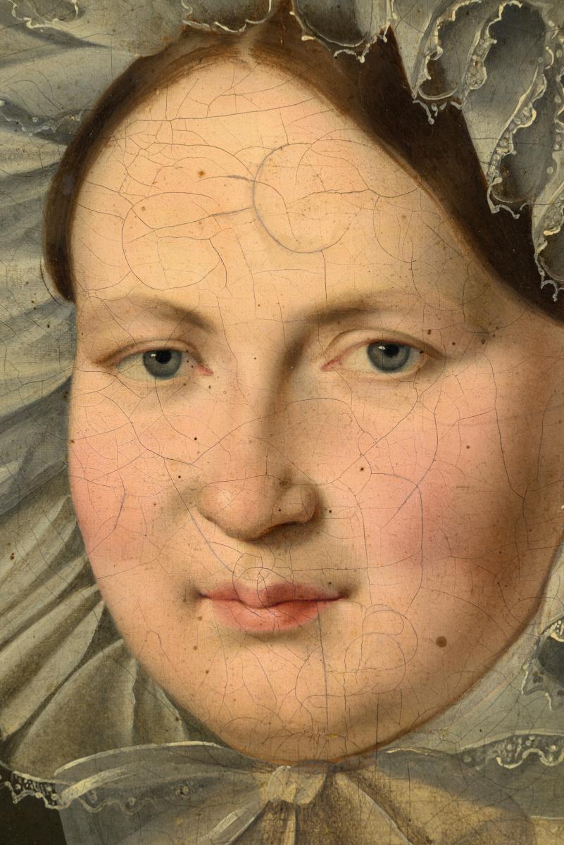 Portrait of a young woman in a dark blue dress with lace hood against a neutral background. Doubled canvas.