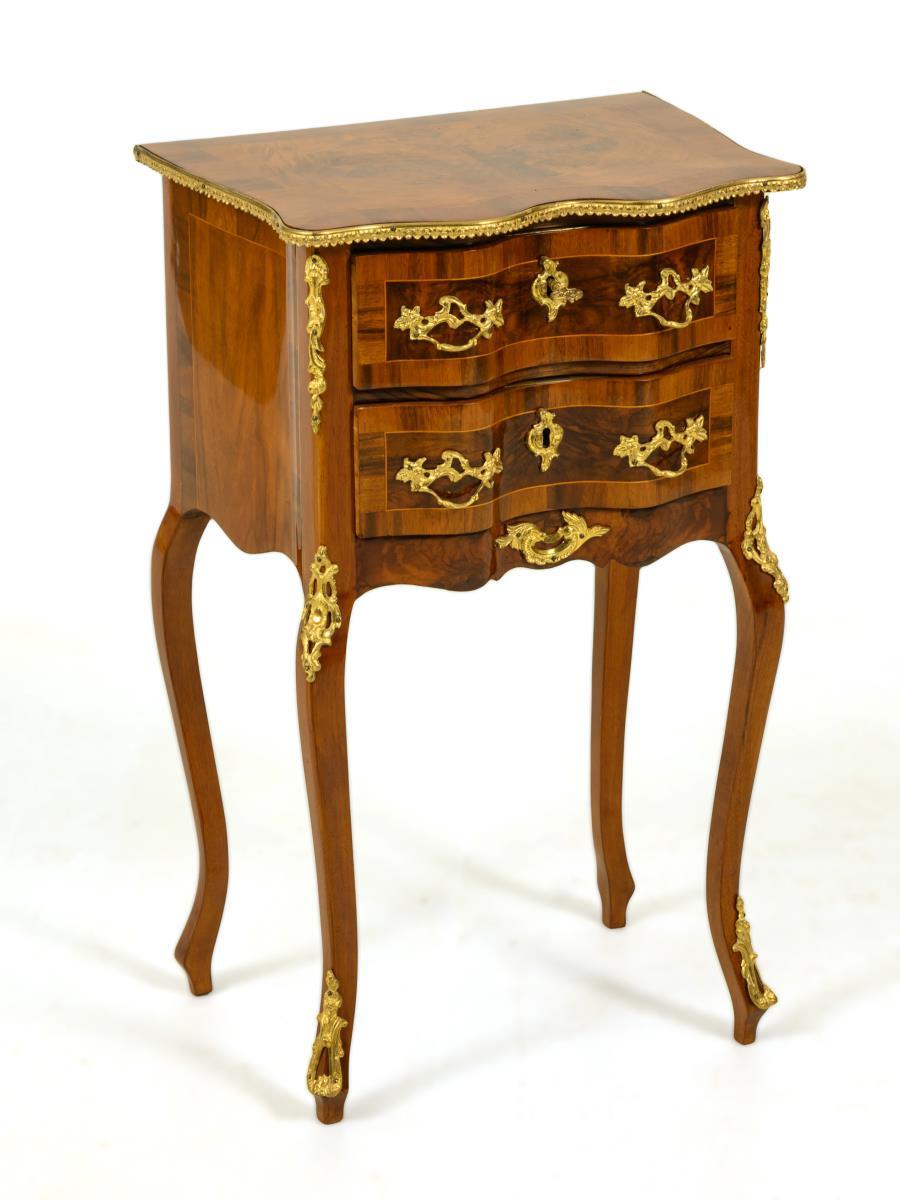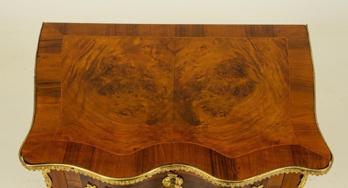 Delicate 2-tier pier chest of drawers in a curved form typical of the style, on 4 curved legs; richly decorated with burl veneer and lavish bronze fittings. Minimal signs of age/use.