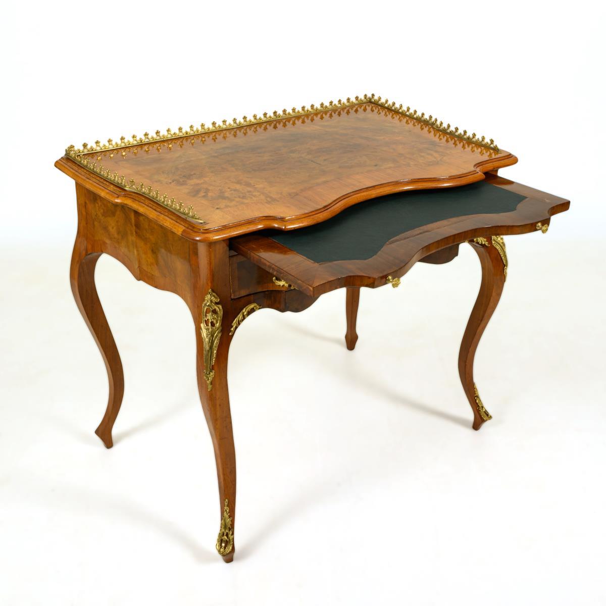 Delicate ladies' desk in a curved form typical of the style, with drawer frame and pull-out writing surface with gray-blue leather cover; lavishly decorated with brass gallery running around 3 sides, bronze fittings in baroque ornamentation and 3 porcelain cartouches with finely painted gallant scenes. Slight signs of age/use, applications partly loose, closed.