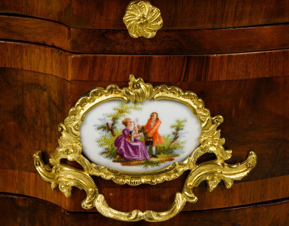 Walnut veneered and burl veneered, painted porcelain, gilt bronze. Approx. 82 x 93 x 62 cm.