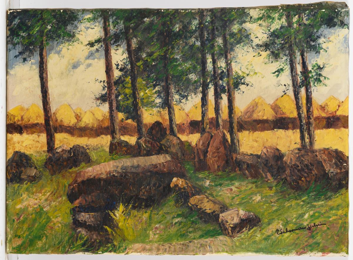 Meadow with rocks in front of slender trees and a field with numerous haystacks. A defect.
