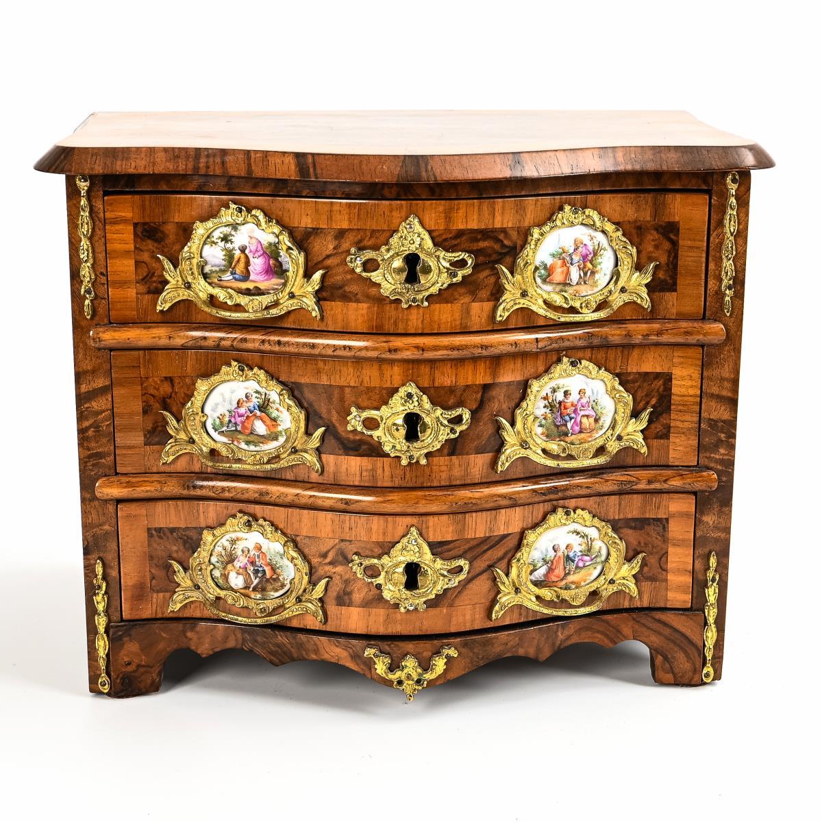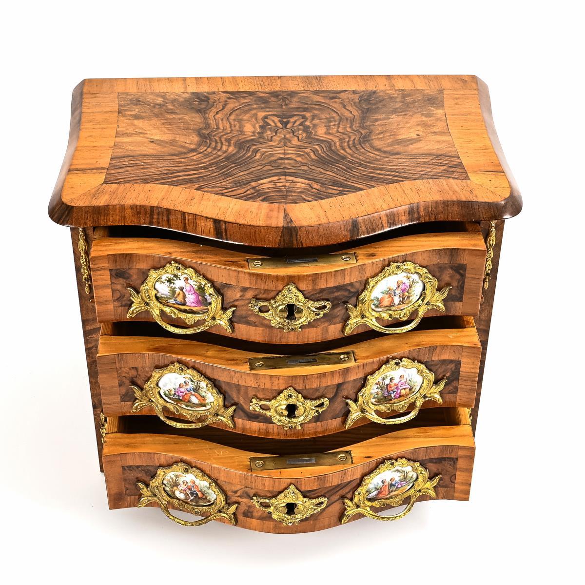 3-tier chest of drawers with curved front, richly decorated fittings with painted plaques (lovers in park landscapes). Restored with 1 small, barely visible addition.