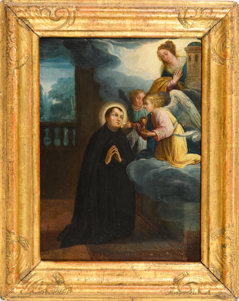 The praying saint on his knees is given the holy sacrament of the Last Supper by angels.