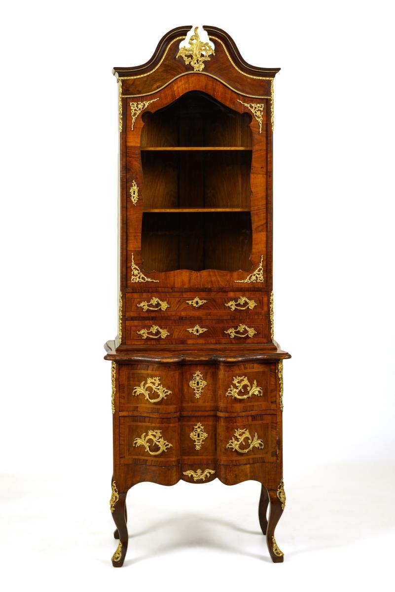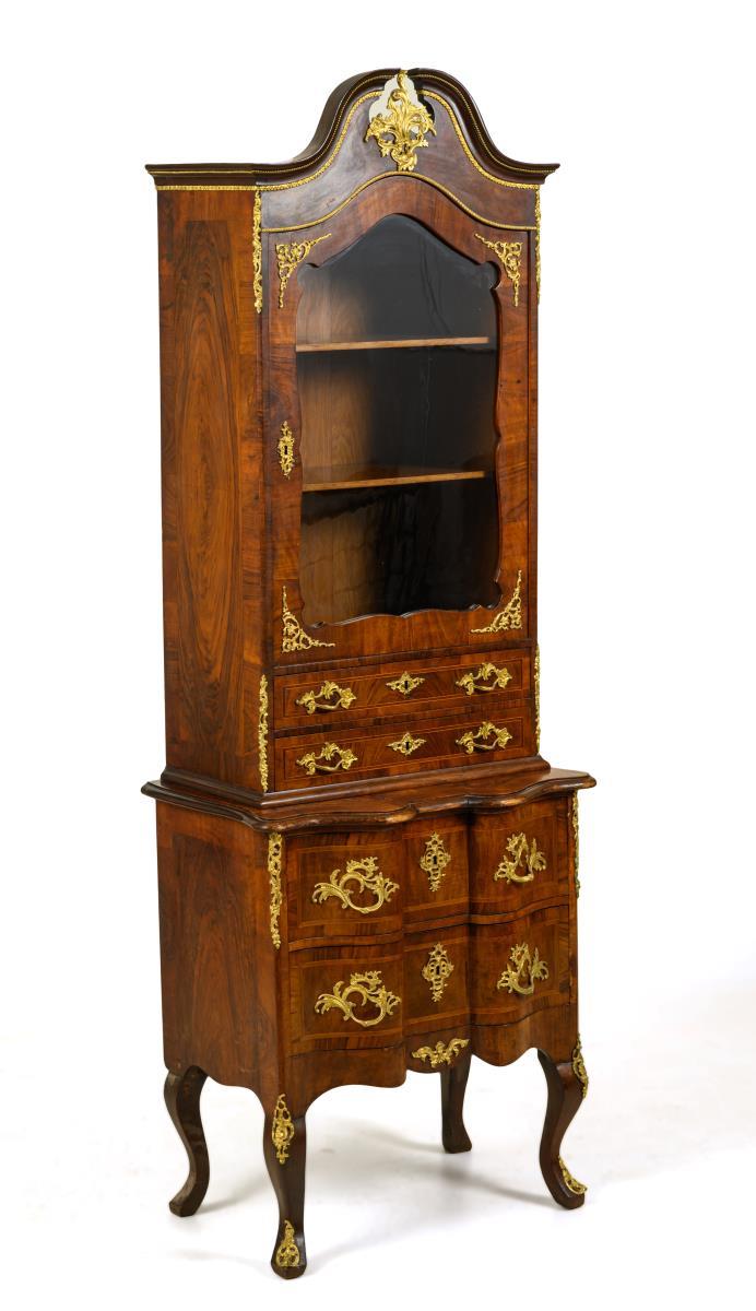 Delicate top-mounted display cabinet with 2-drawer chest of drawers on 4 curved legs, added 1-door top with glazed front, 2 drawers and sprung pediment; lavishly decorated with bronze fittings; top with 2 shelves. Top added, slight signs of age/use, veneer with minor defects.
