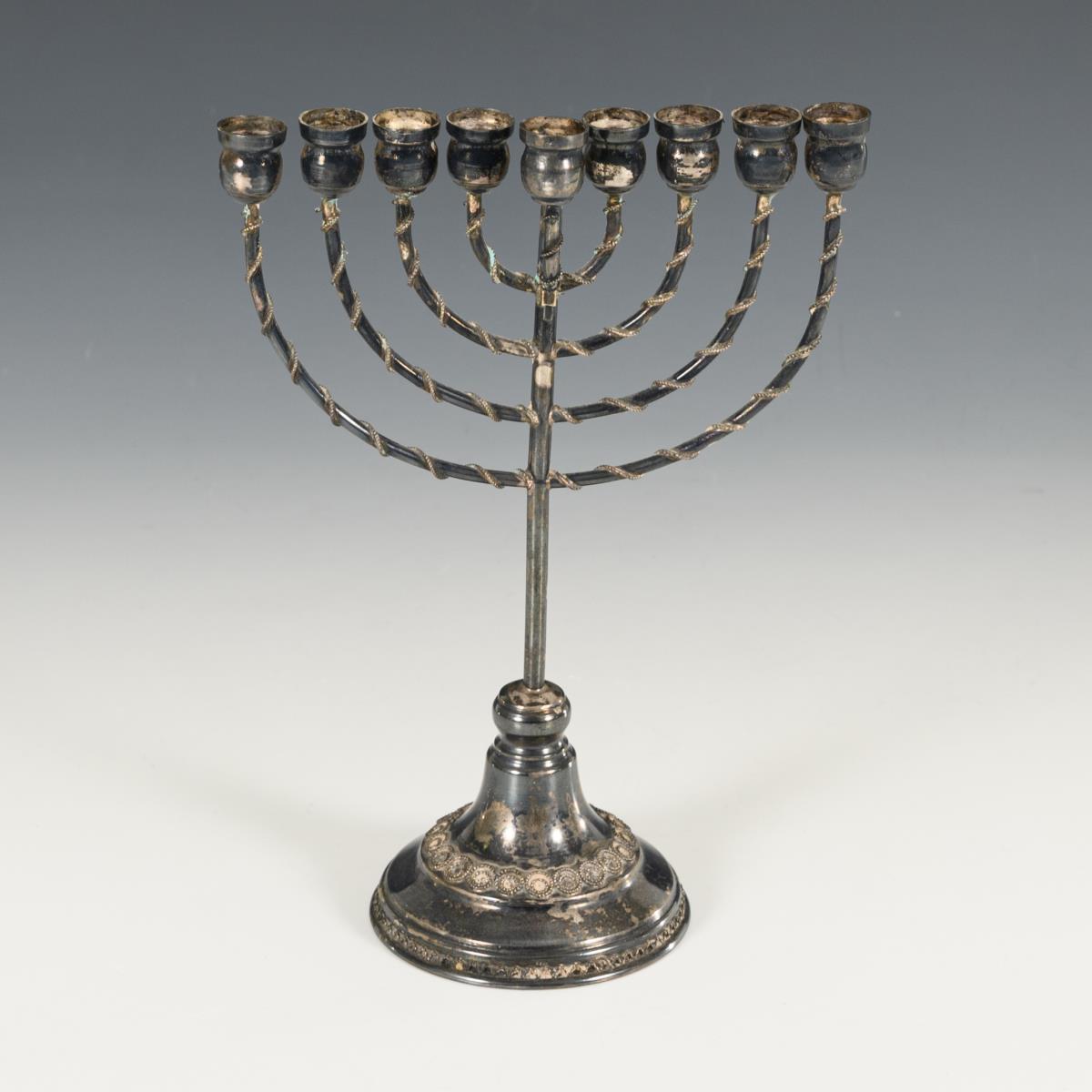 8-arm or 9-flame (with a "servant") chanukiah on a bell-shaped round base. Soldered joints.