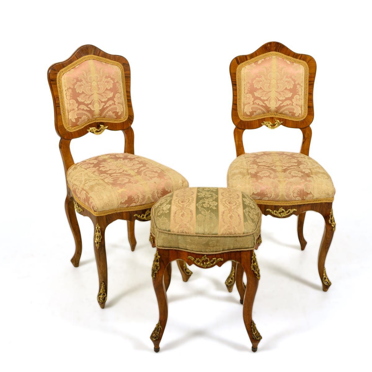 2 upholstered armchairs (h 94 cm each, seat height approx. 48 cm) and a stool (h approx. 50 cm) in a curved shape typical of the style, decorated with lavish bronze applications; chairs champagne-pink striped with brocade pattern, stool champagne-green striped. Signs of age/wear, applications partly missing.