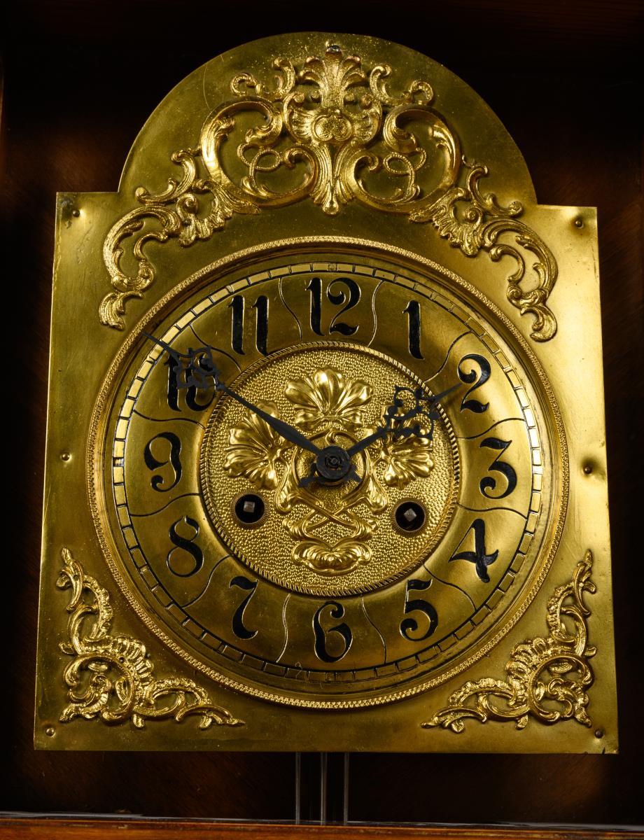 Marked movement with half hour strike on gong. Function not tested, in need of revision. Brass dial as a round arched shield with floral applications, Arabic numerals and minute ring, pierced fantaisie hands.