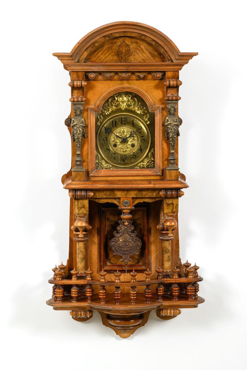 Elaborately designed historicism wall clock with rich turnery, pillar and tenon decoration, round arch pediment, female caryatid herms, magnificent pendulum board with coffered decoration, bronze fittings. Signs of age and wear, crowning missing, some fittings probably missing, pendulum spring cracked.