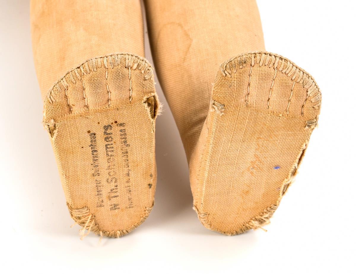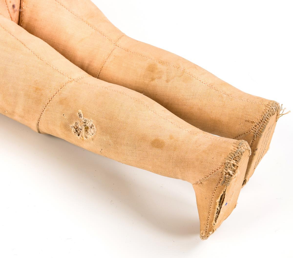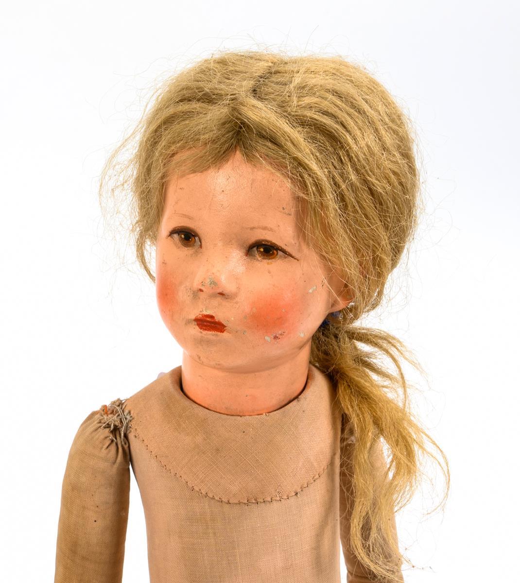 Crank head with 1 seam on the back of the head, painted brown eyes and blond real hair wig. Slender, slightly soiled fabric body. Face with small paint defects. Body with repairs and defects.
