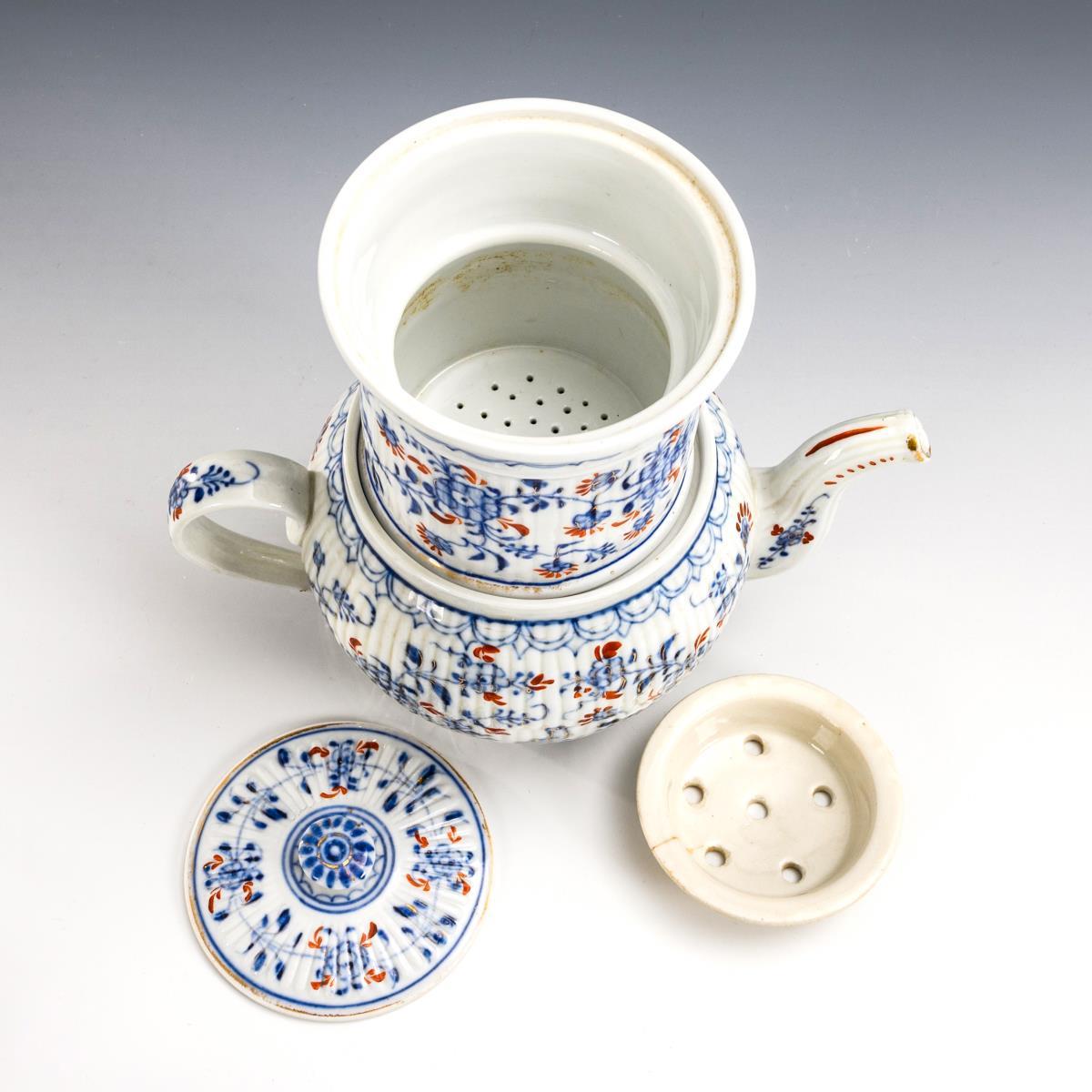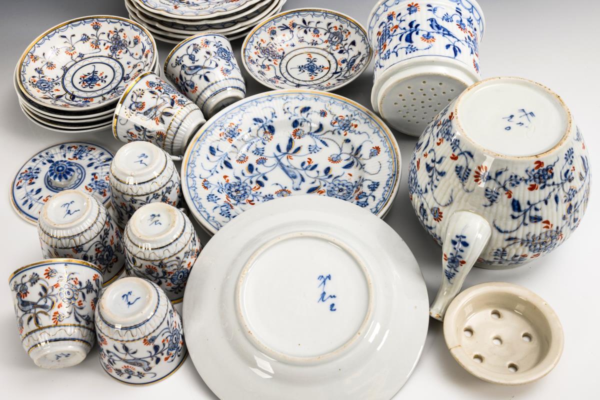 Partly "Broken rod" model, partly smooth form. Jug with filter attachment, additional strainer insert and knobbed lid (h 21 cm in total), 7 cups (h 6 cm), 6 saucers (Ø 12.5-13 cm) and 6 + 3 plates (Ø 6x 17 and 3x 18 cm). Partial gold abrasion, 1 plate and 1 saucer with hairline spider.