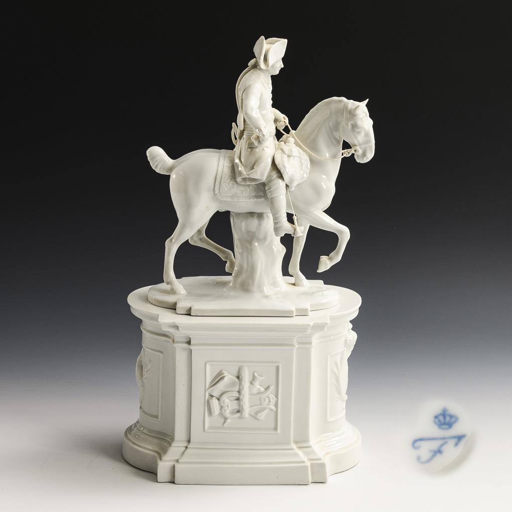 Sculpture of the Prussian King Frederick II on horseback (H 29.5 cm). / Architectural base with trophy reliefs and the monogram "FR" (= Fridericus Rex) (H 19 cm). Equestrian sword blade missing, reins and stirrups made of white cord replaced, 1 curb tree glued, chip to 1 edge of the base.
