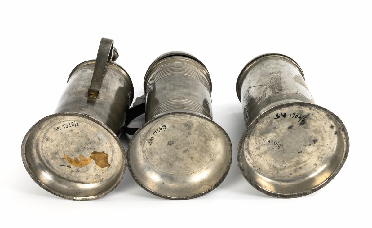 3 pewter roller jugs.