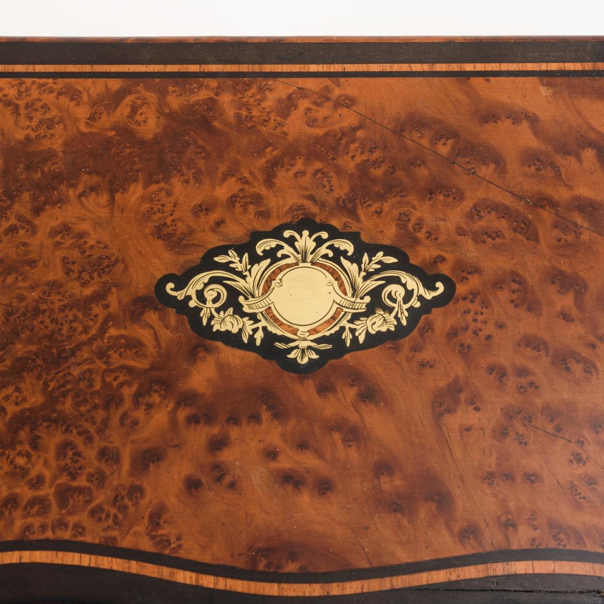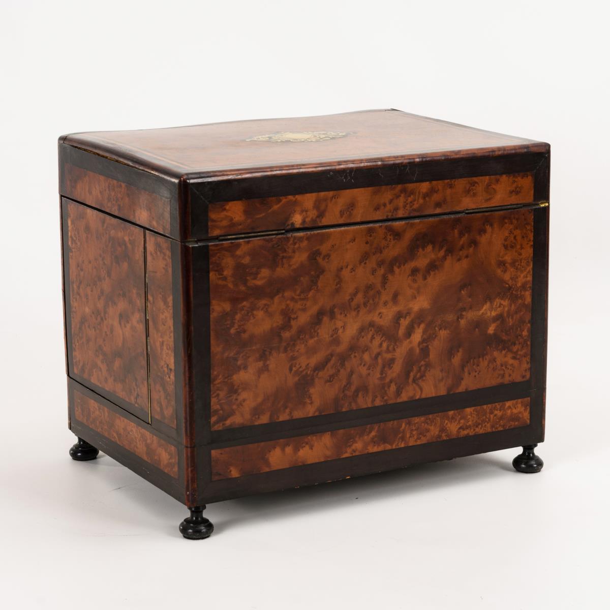 Mahagoni-Maserfurnier, Messing- sowie ebonisierte Einlagen.