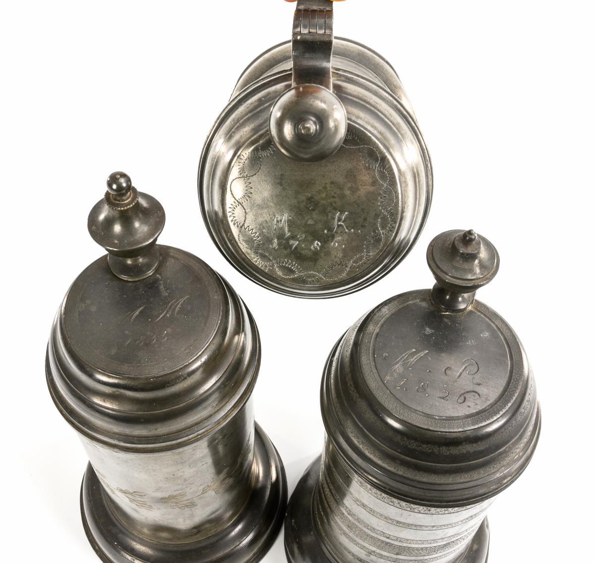 3 pewter roller jugs.