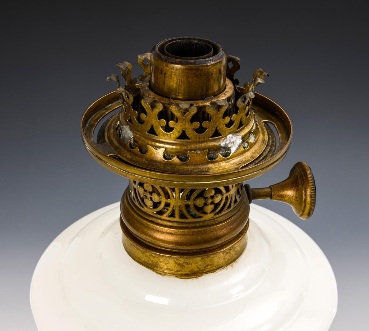 Tin, milk glass, brass, clear glass. H 44 cm (without chimney).