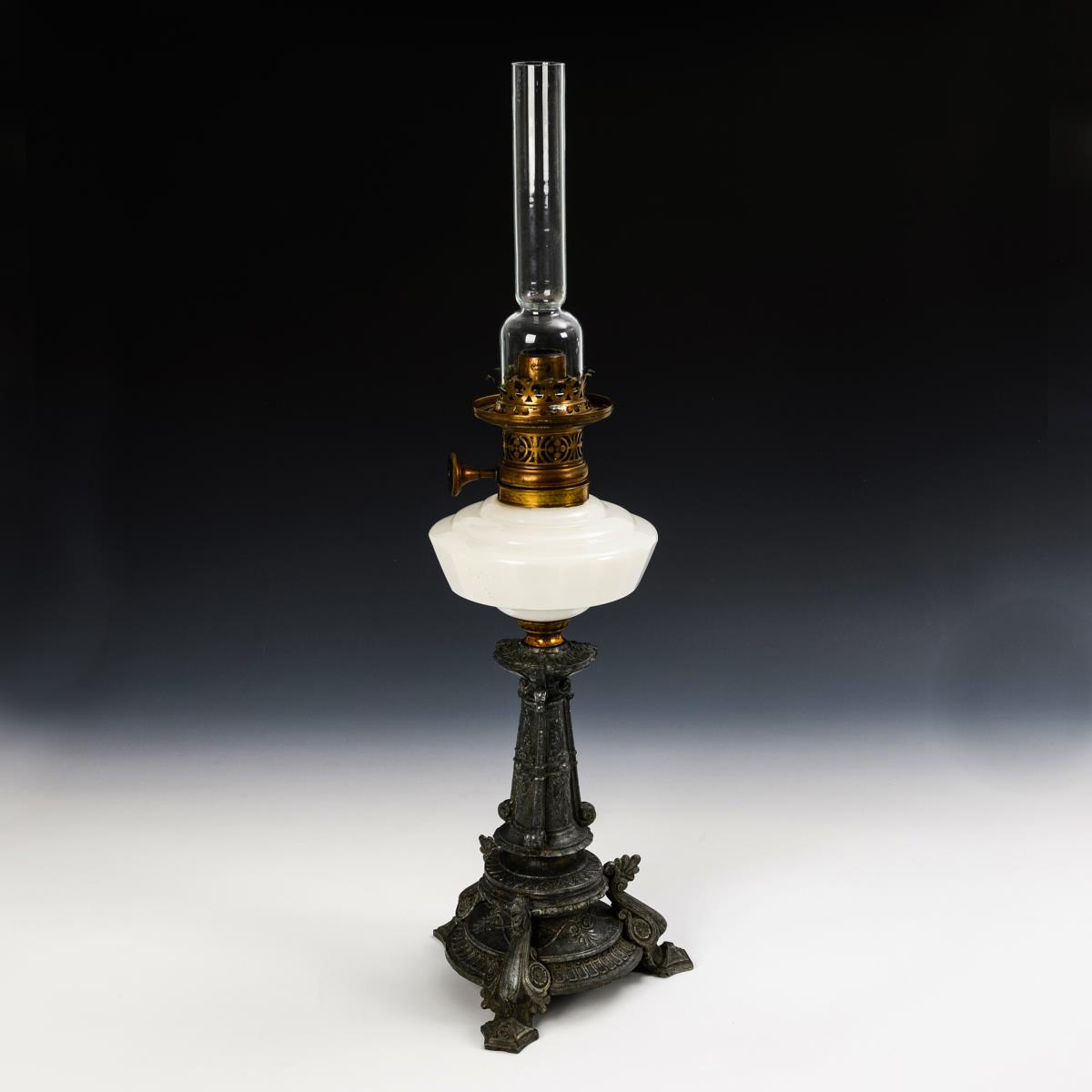 Richly decorated, solid base with 3 legs on a profiled foot and 3 pilasters on a pyramidal column shaft. Mounted glass tank with faceted, polished walls and round burner with chimney. Tin tarnished with remnants of removed paint. Wick missing, chimney not suitably replaced.