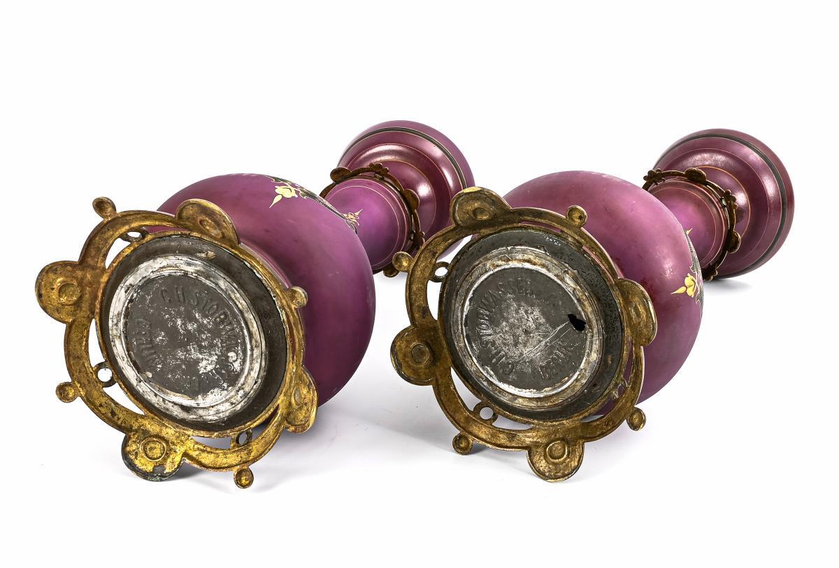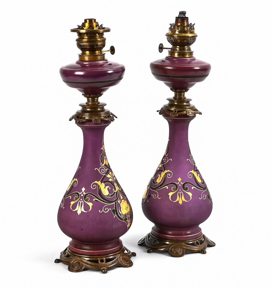 Glass vase body with gold-stamped ornament on a bronze base, screwed-on ceramic tank in the same color. Various round burners (Brendel & Loewig Berlin or Delfin marked on the anchor). Each without shade and chimney, 1 gallery missing, 1 small repair and 1 chip to the tank, inner fire tube attachment bent.