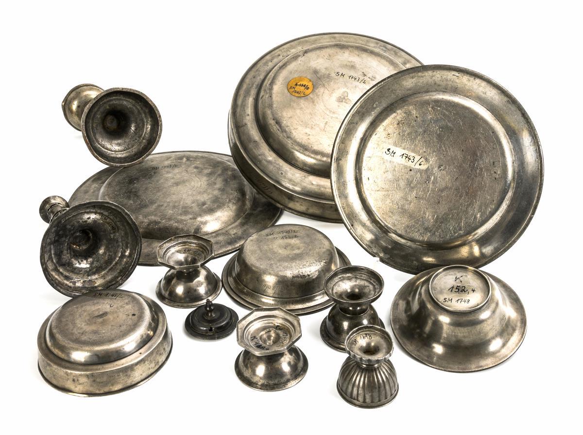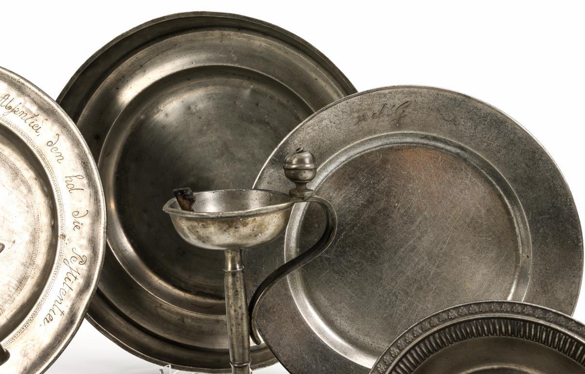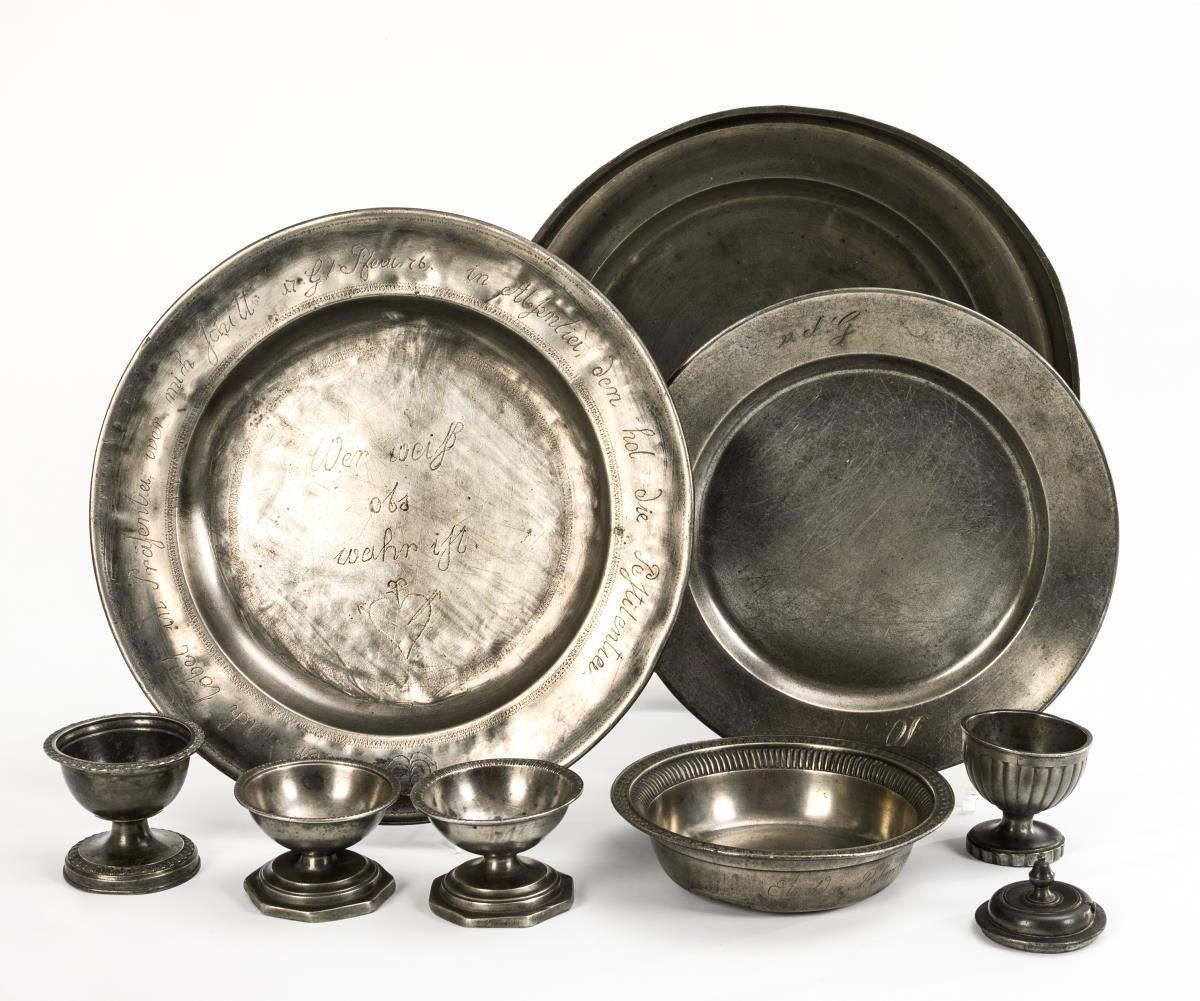 1 bowl with roughened bands. 2 plates (1x with braided sayings "Wer mich lobt in Präsentia, wer mich schilt in Absentia, den hol die Pestilentia" and "Wer weiß, obs wahr ist" as well as date "1776"). 3 different bowls (1x with relief friezes). 4 salt cellars (1x with unassociated lid), including 2 very similar ones. 1 baluster candlestick with defective spout and engraved "TT 1787". 1 oil lamp with open oil bowl. Signs of age/use.