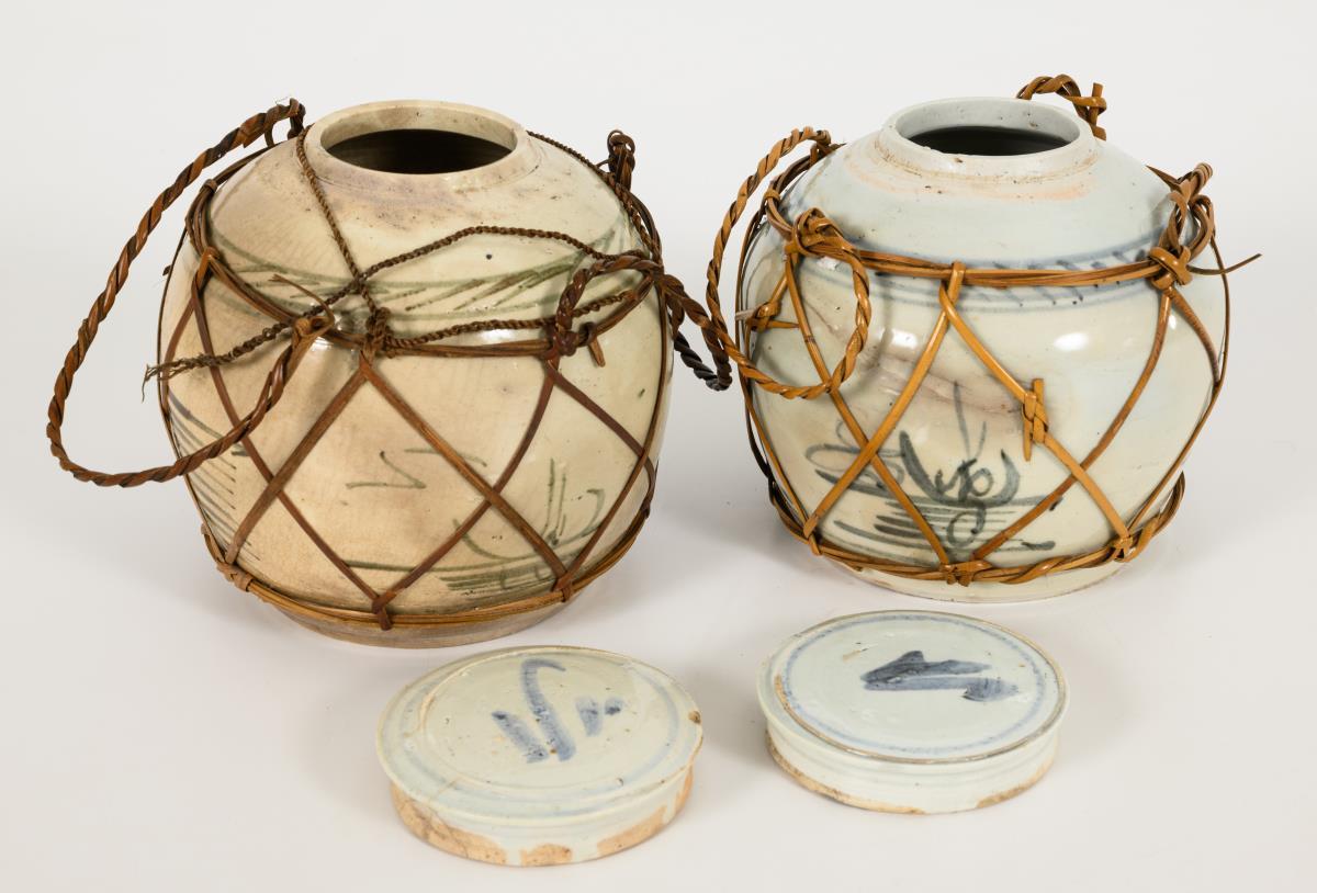 Lidded vessels with very strongly stylized or reduced landscape depiction in underglaze blue. One vessel with crackled surface, resulting in darker glaze tint. Production-related irregularities. Old chips to the rims. The lighter vessel with discolored glaze crack.